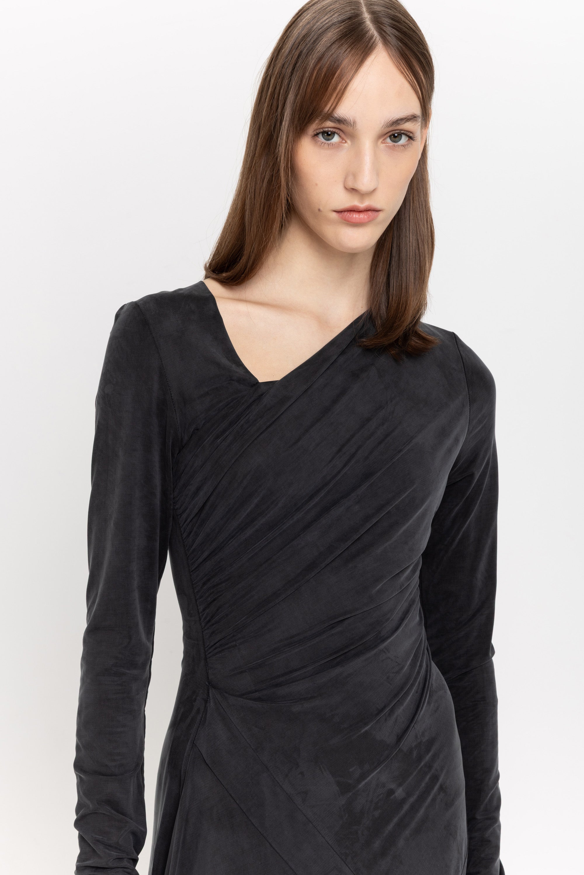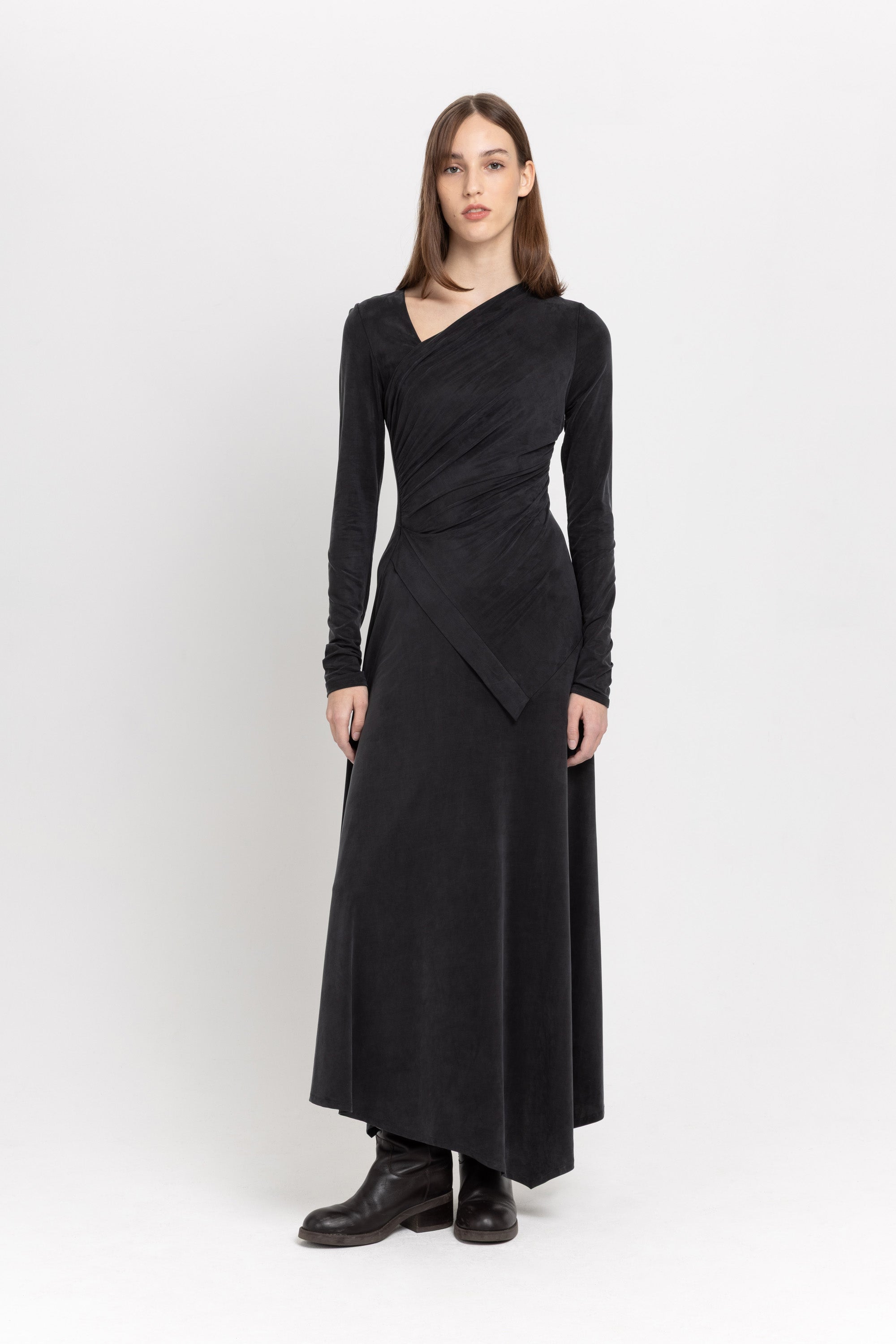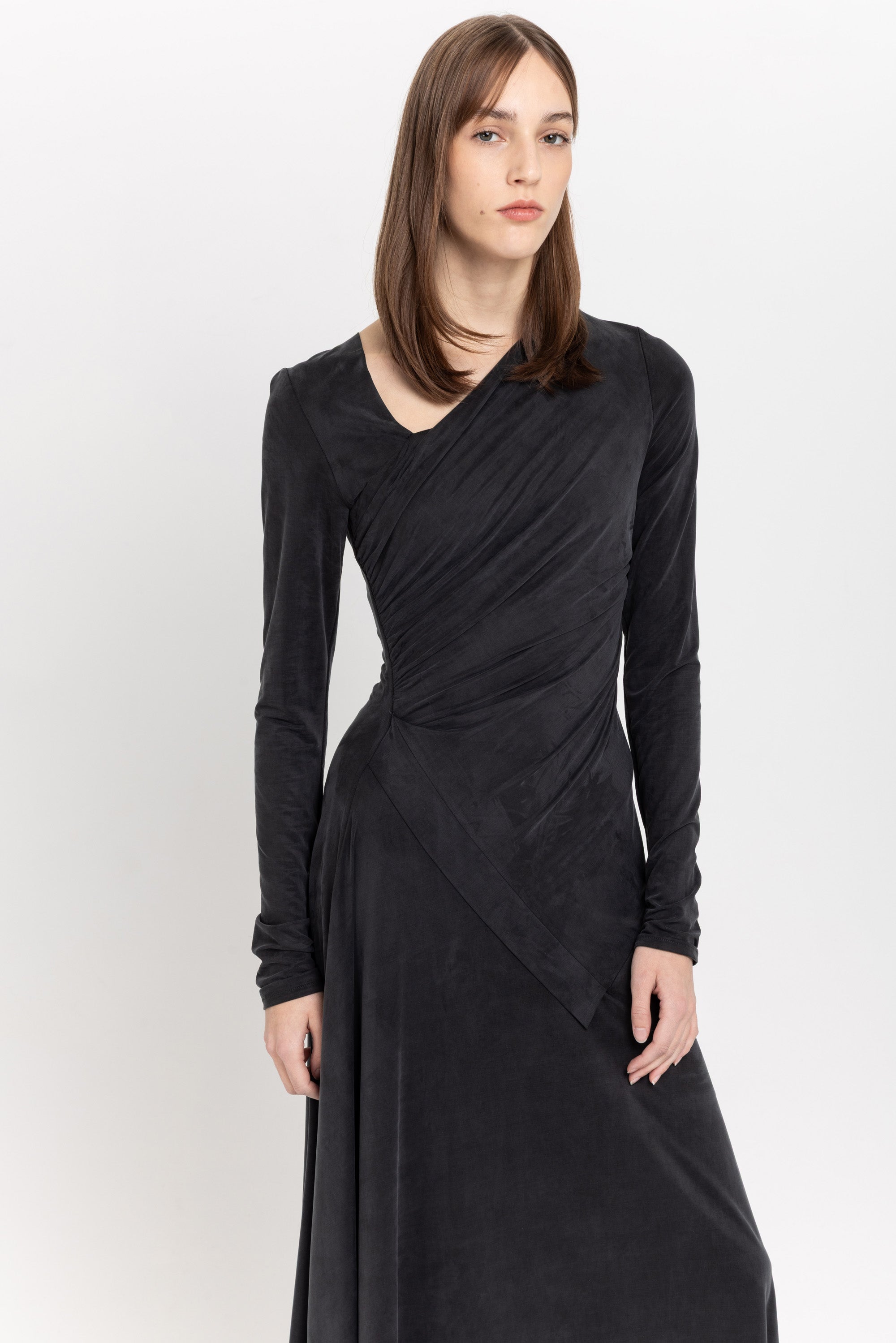 The DOMOKO dress in anthracite cupro jersey features an asymmetric ruched design, long sleeves, and a distinctive neckline. It's midi length and relaxed, refined drape creates an effortlessly cool, contemporary silhouette.
