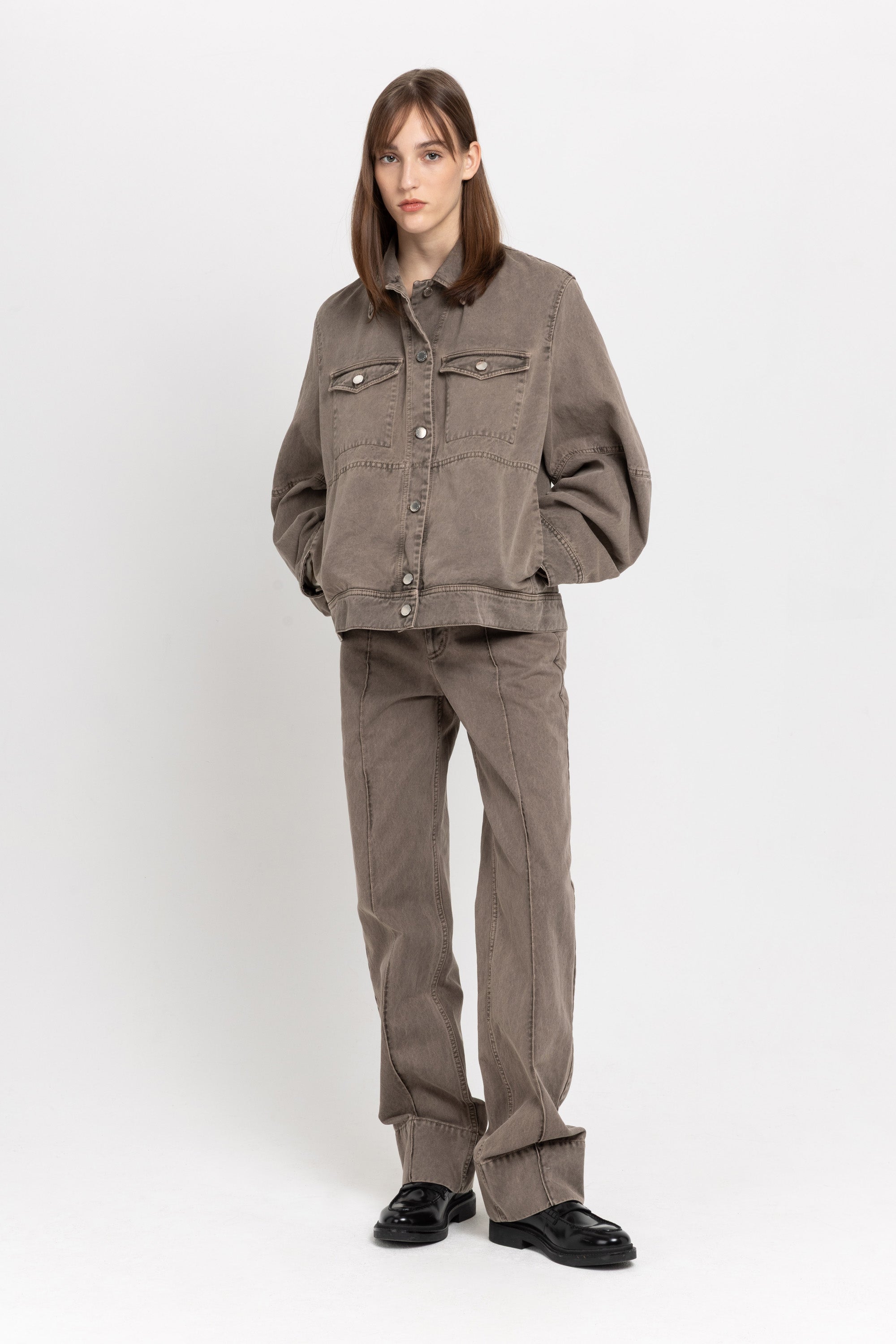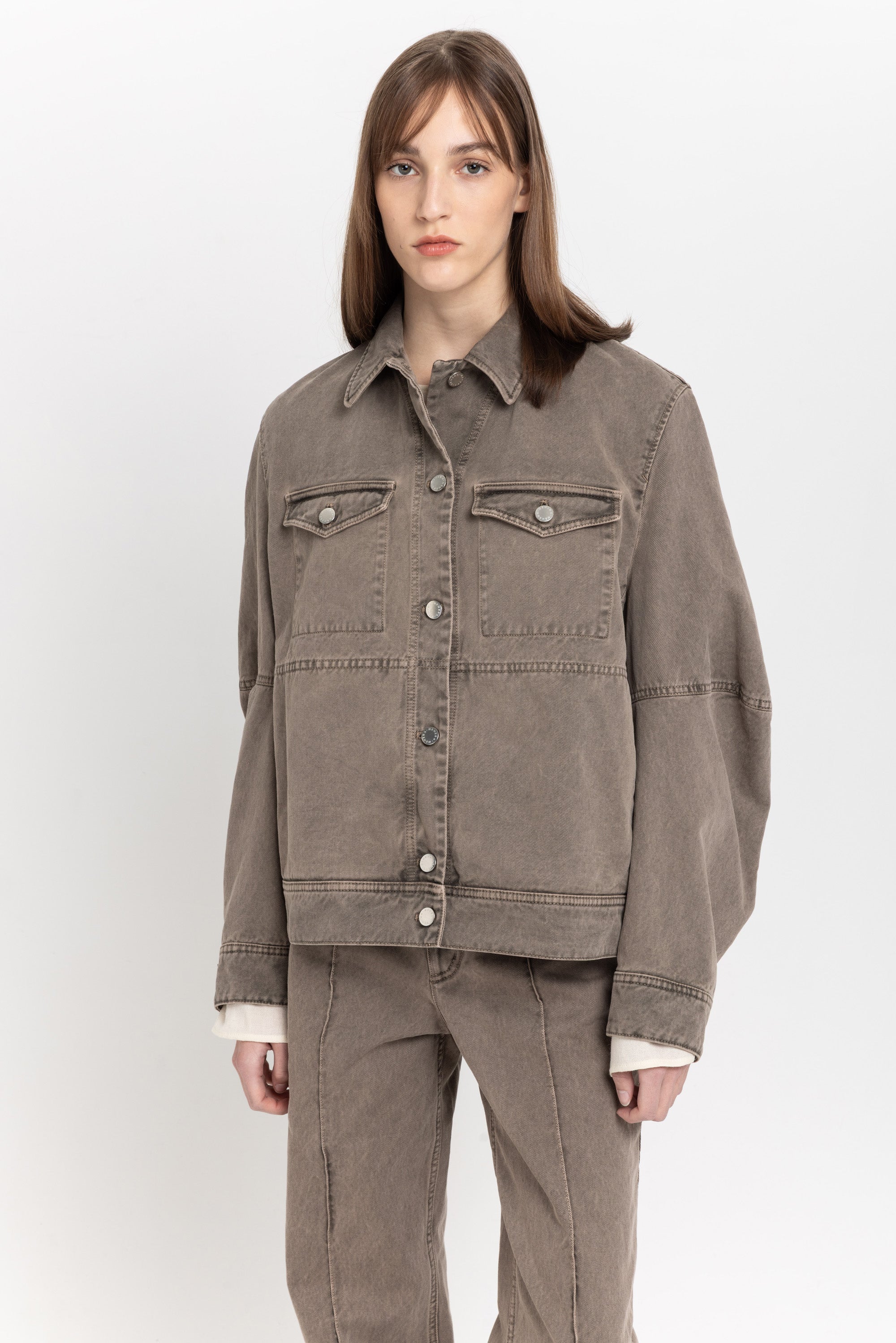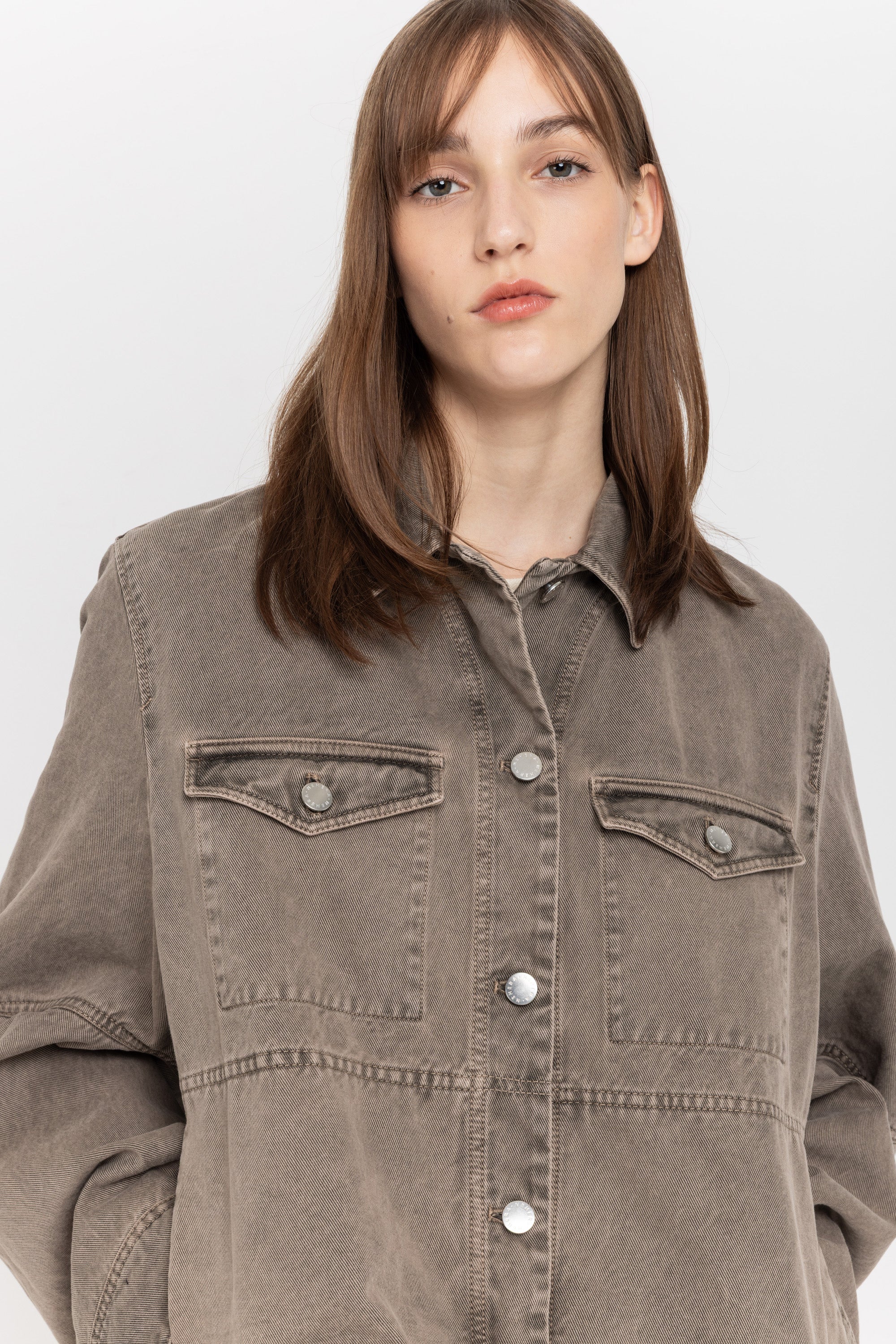 JUMI brown denim jacket crafted from denim for a structured yet relaxed fit. Featuring minimalist button details and two chest pockets, it’s a timeless essential that blends effortless style with everyday utility. Pair it with the PINTA jeans for a coordinated look.