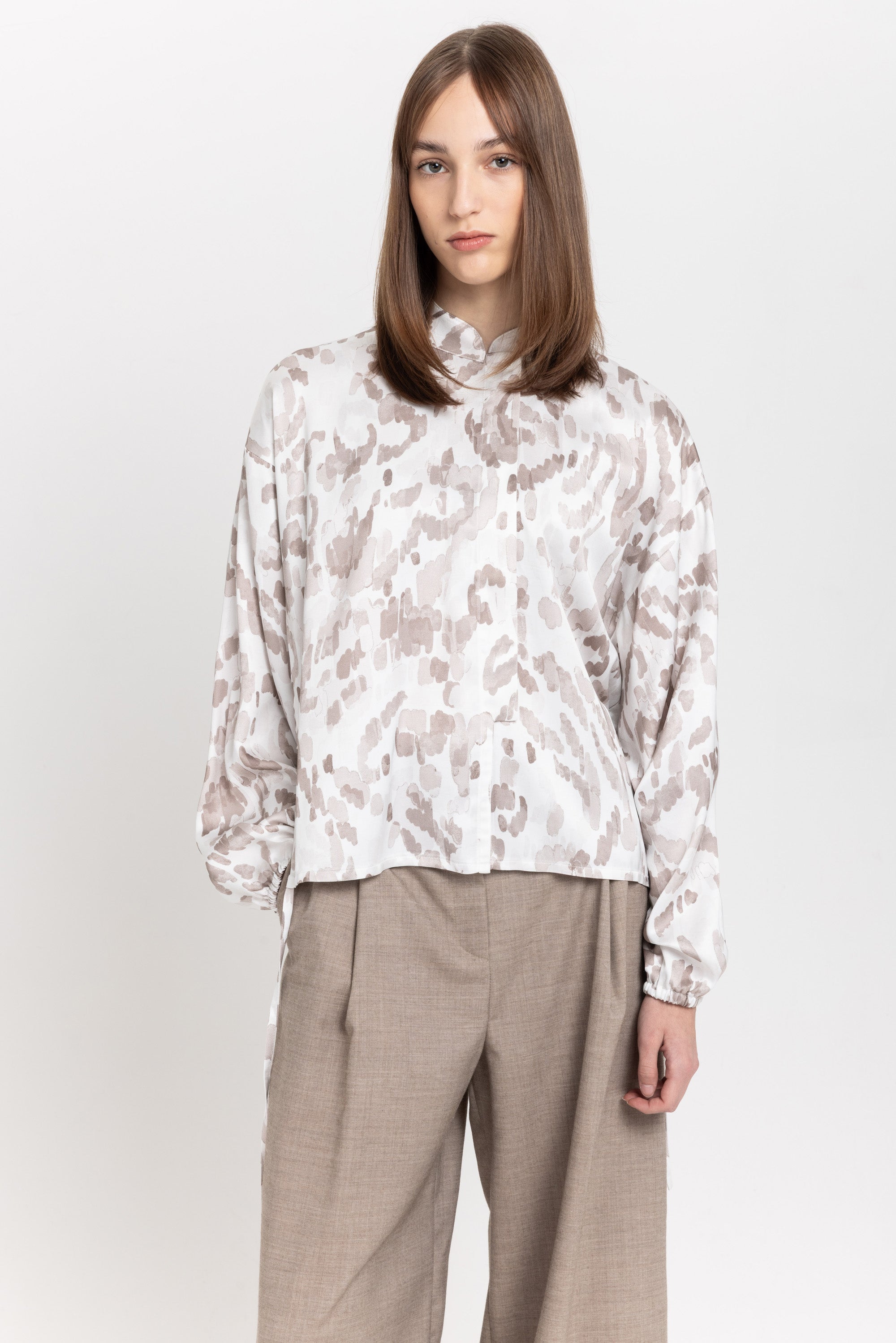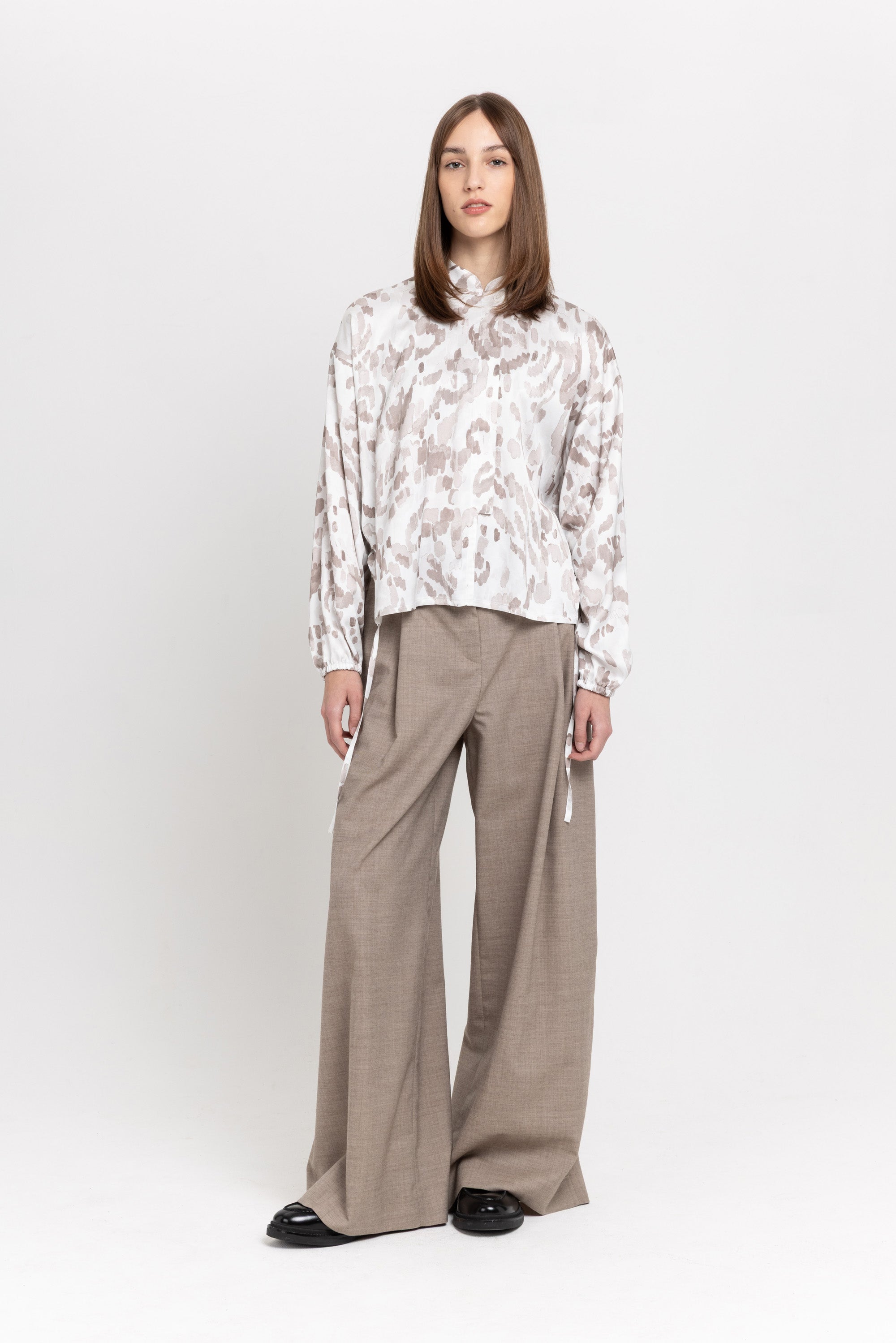 The BAMILIA blouse in watercolor taupe is crafted from fluid viscose with a collarless neckline, side ties, and voluminous sleeves, defining a relaxed silhouette with quiet refinement.