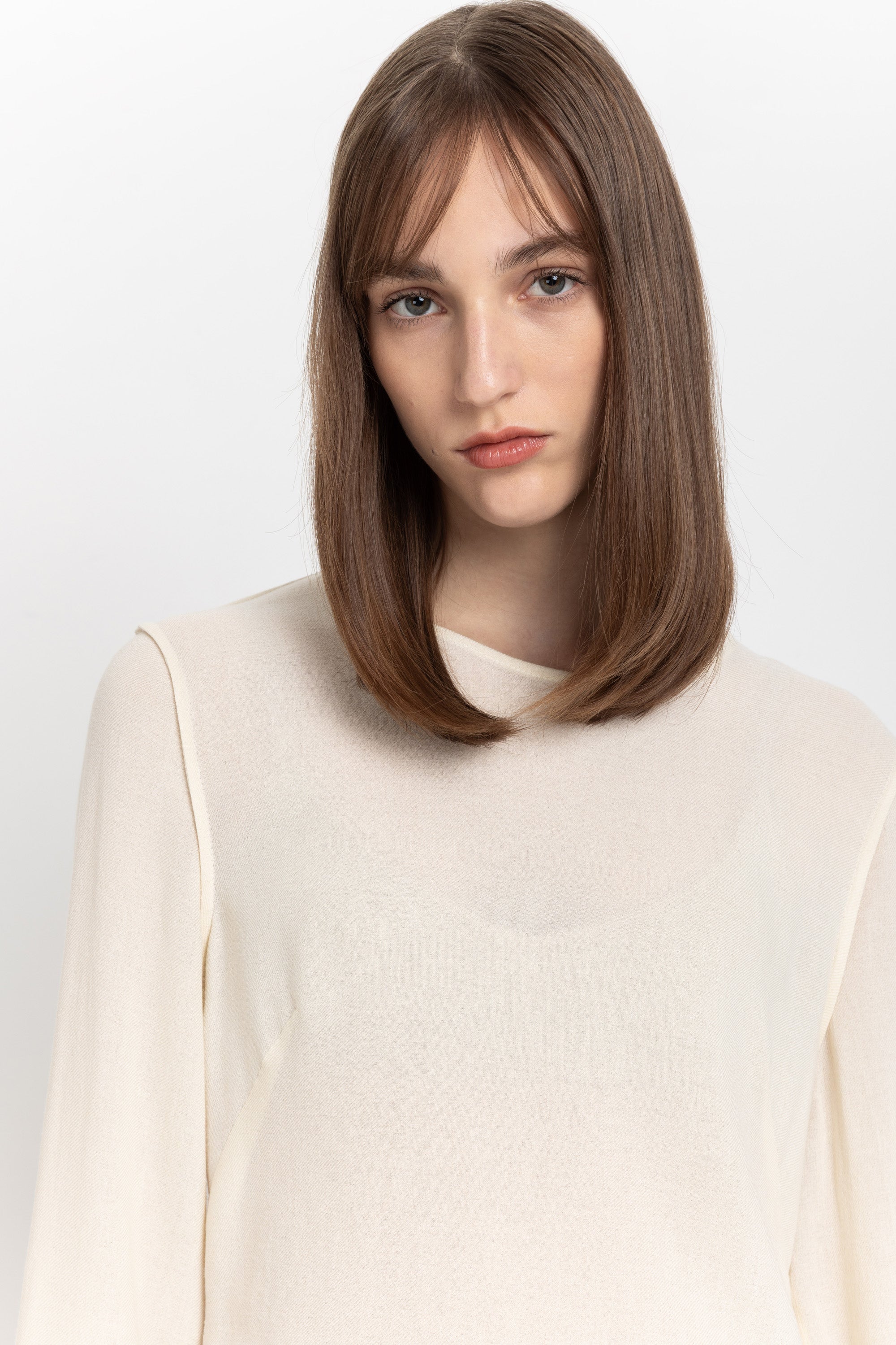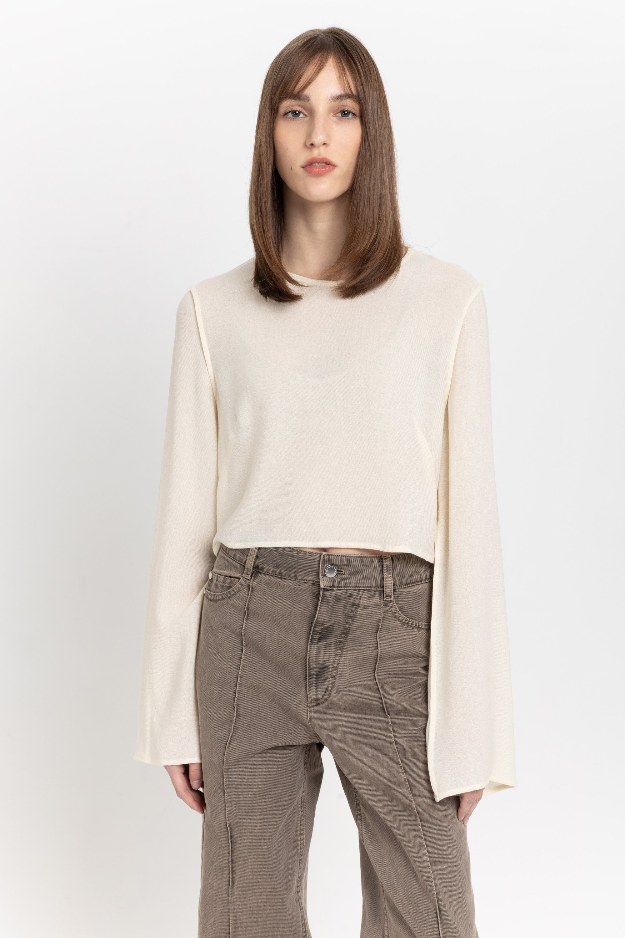 The TORIANA  top is tailored from a soft viscose-wool blend in a cream tone, cut with long bell sleeves and a clean round neckline. The silhouette is cropped and structured, offering a modern proportion that layers effortlessly.
