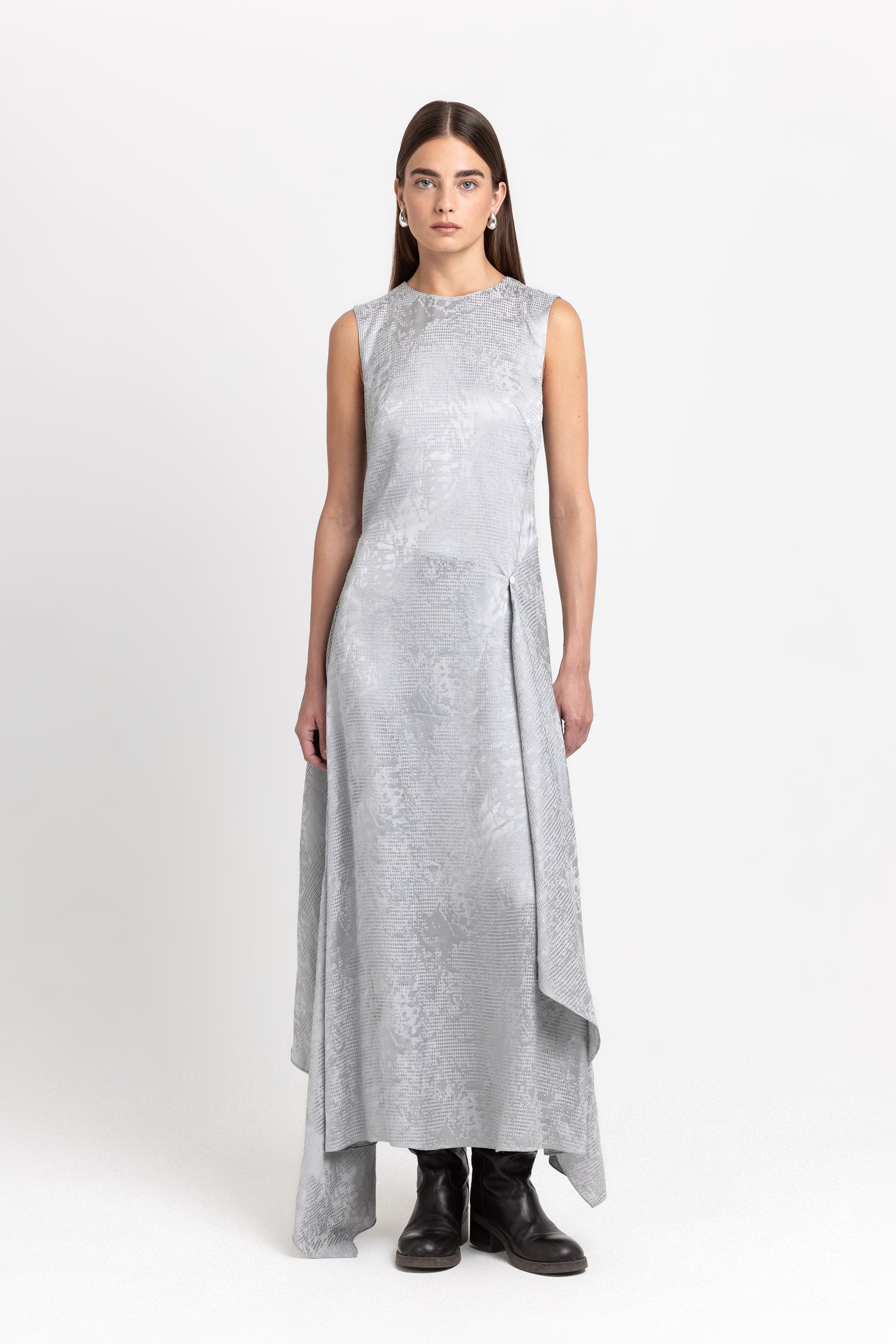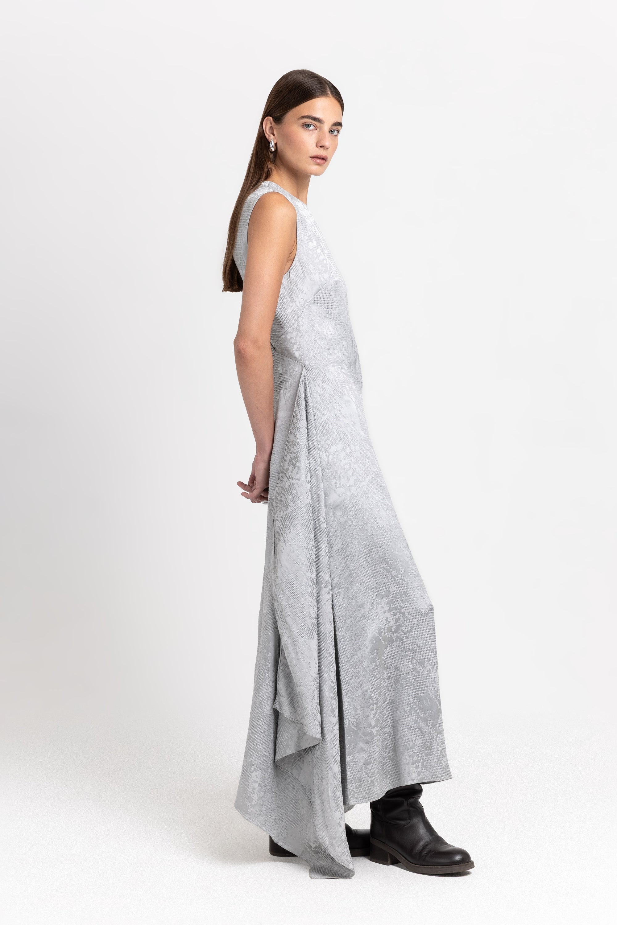 DAMARA dress in silver color features a subtle waffle texture that brings understated depth to its fluid silhouette. Sleeveless and effortlessly draped, it exudes refined ease, while subtle back cutouts offer a modern contrast. The front button detail secures the skirt, balancing simplicity and movement.