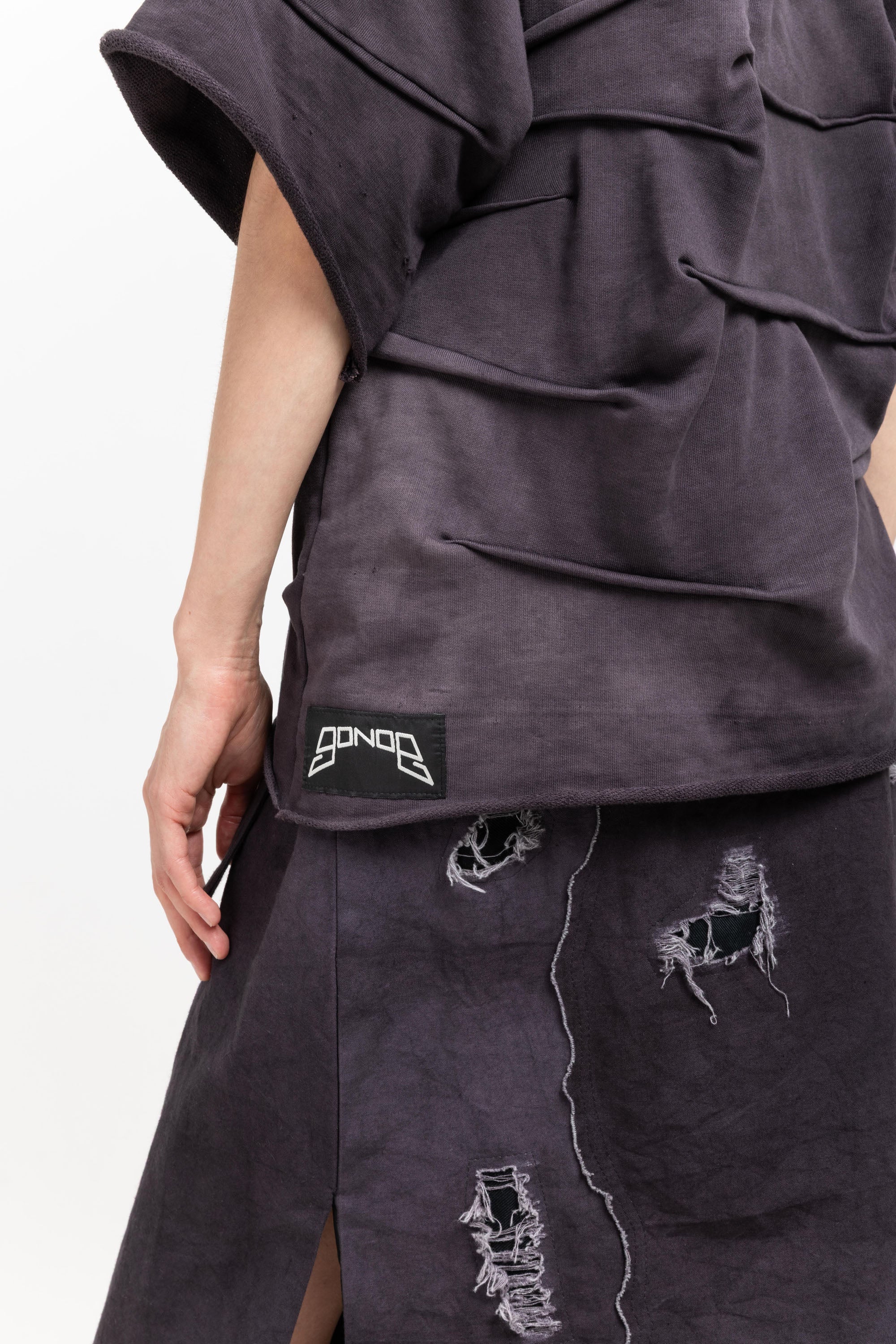 The GONOE brown denim skirt is crafted with a distressed finish, offering a timeless yet edgy take on a classic silhouette.