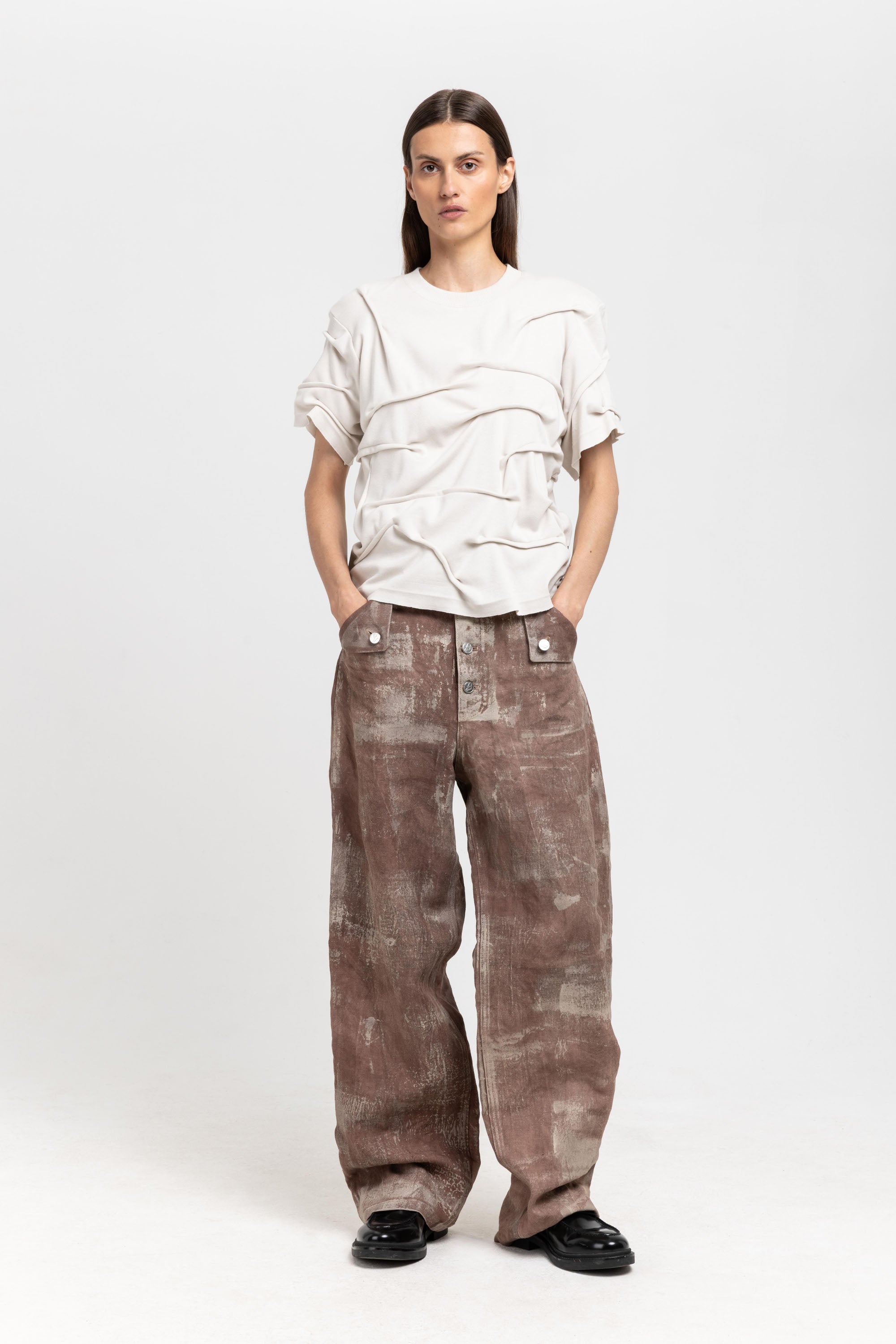The GONOE unisex trousers are crafted from archived linen, hand-dyed and lightly distressed. Designed with a wide, oversized fit, they feature silver-tone accents and a sculptural silhouette that reflect the GONOE signature.