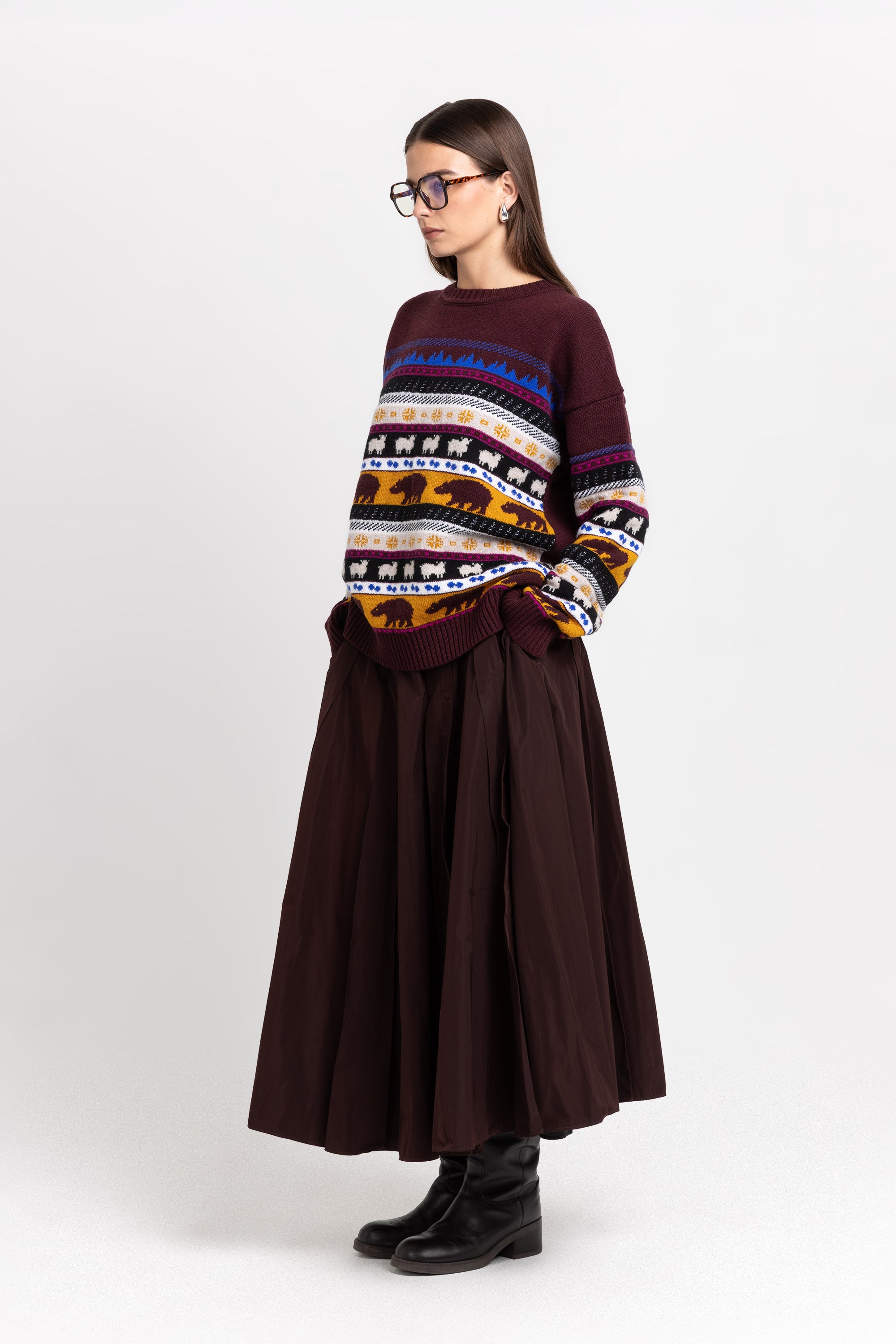 An elevated interpretation of a winter classic, this jacquard pullover is knitted from fine merino wool in a dark seasonal palette. It features a relaxed unisex silhouette and intricate woven motifs inspired by the wilderness.