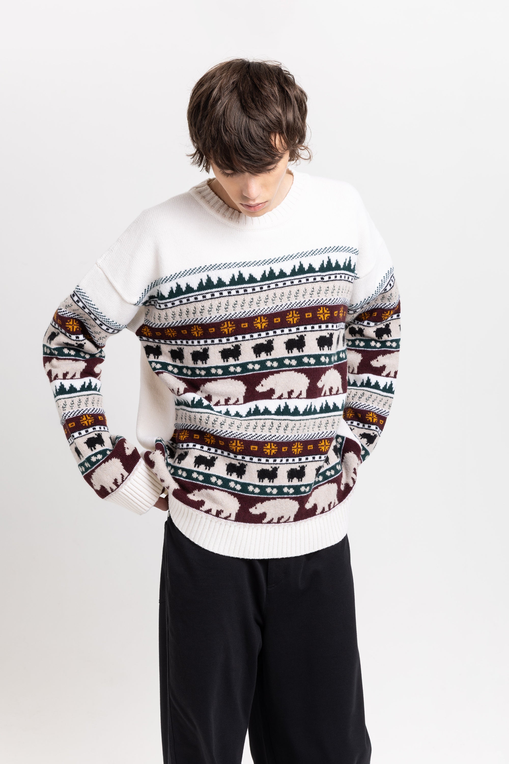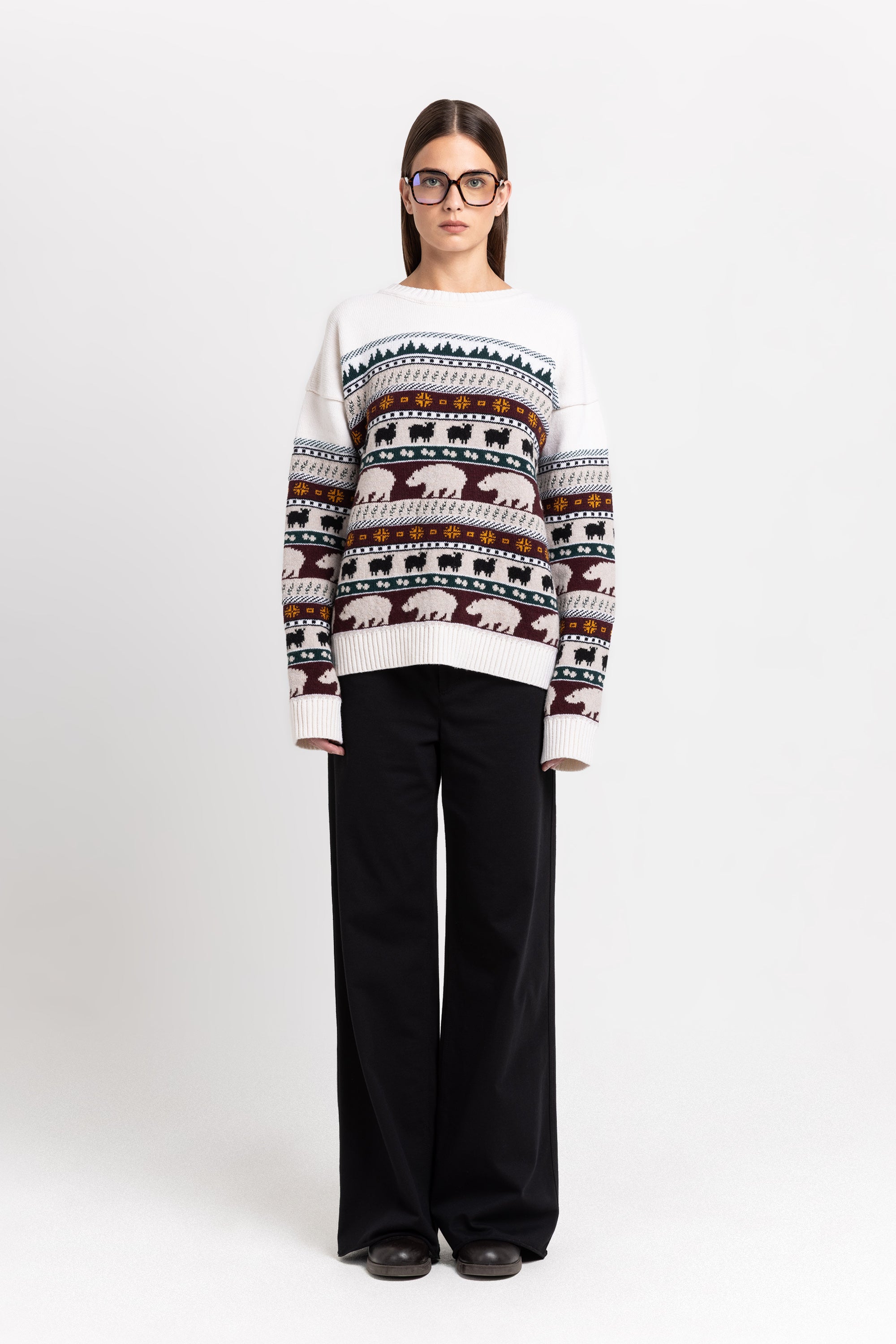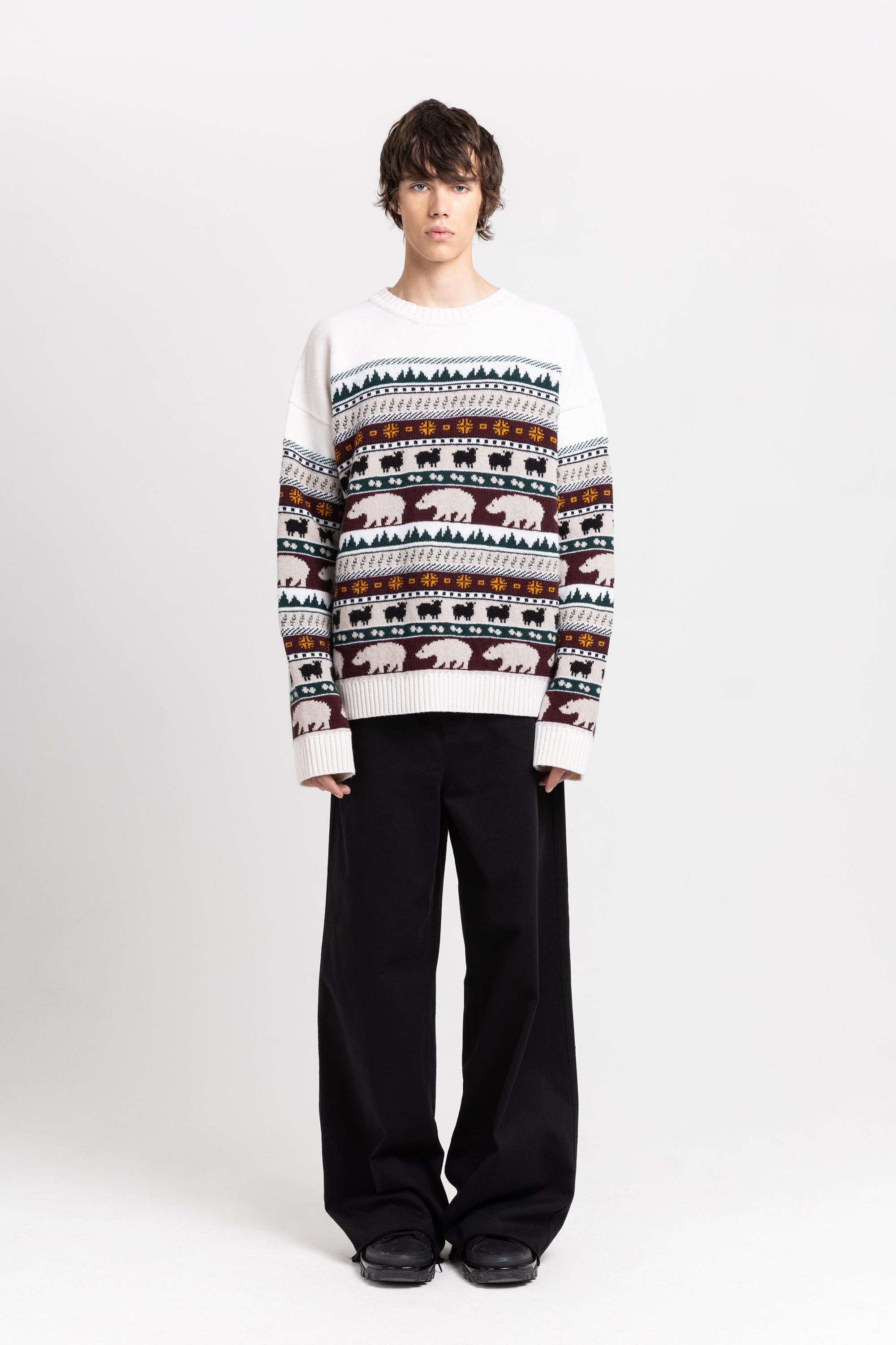 An elevated interpretation of a winter classic, this jacquard pullover is knitted from fine merino wool in a light seasonal palette. It features a relaxed unisex silhouette and intricate woven motifs inspired by the wilderness.