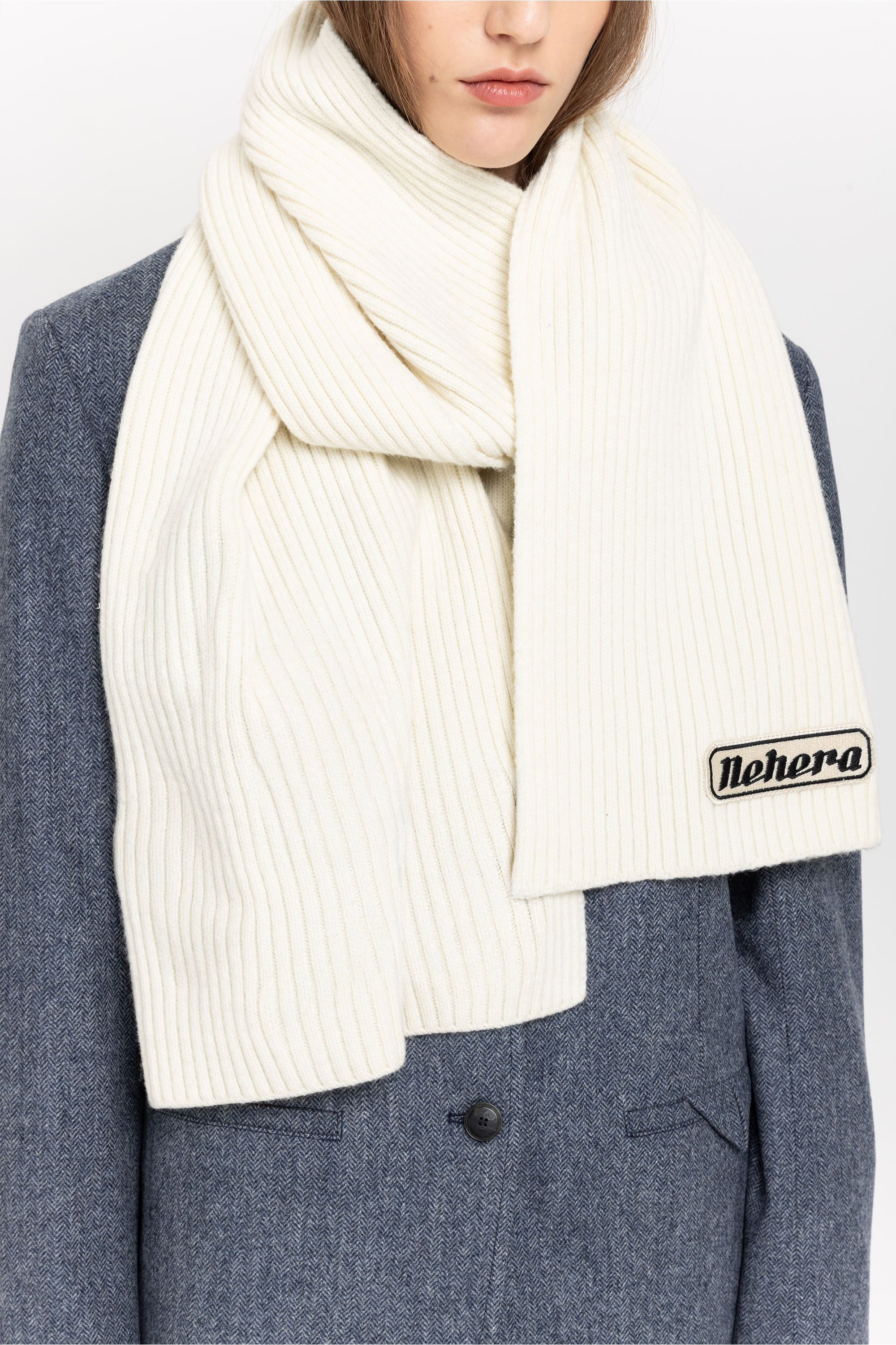 The KBLFW2509A scarf in white is a chunky merino blend adorned with our NEHERA heritage logo. It's designed for a 176 cm x 32 cm format.