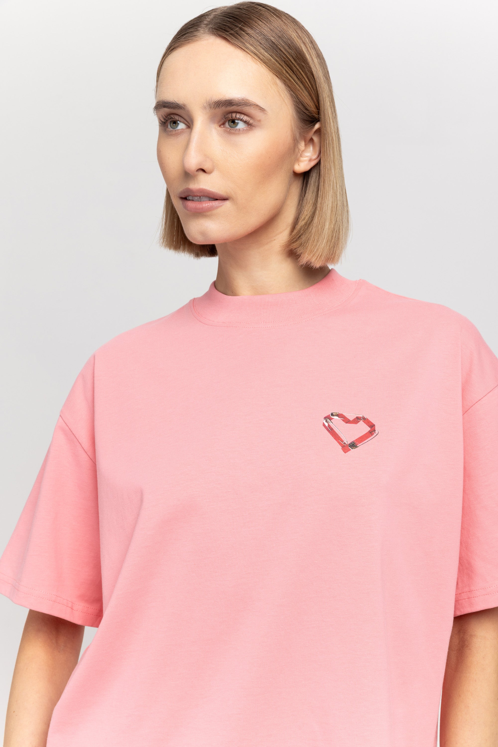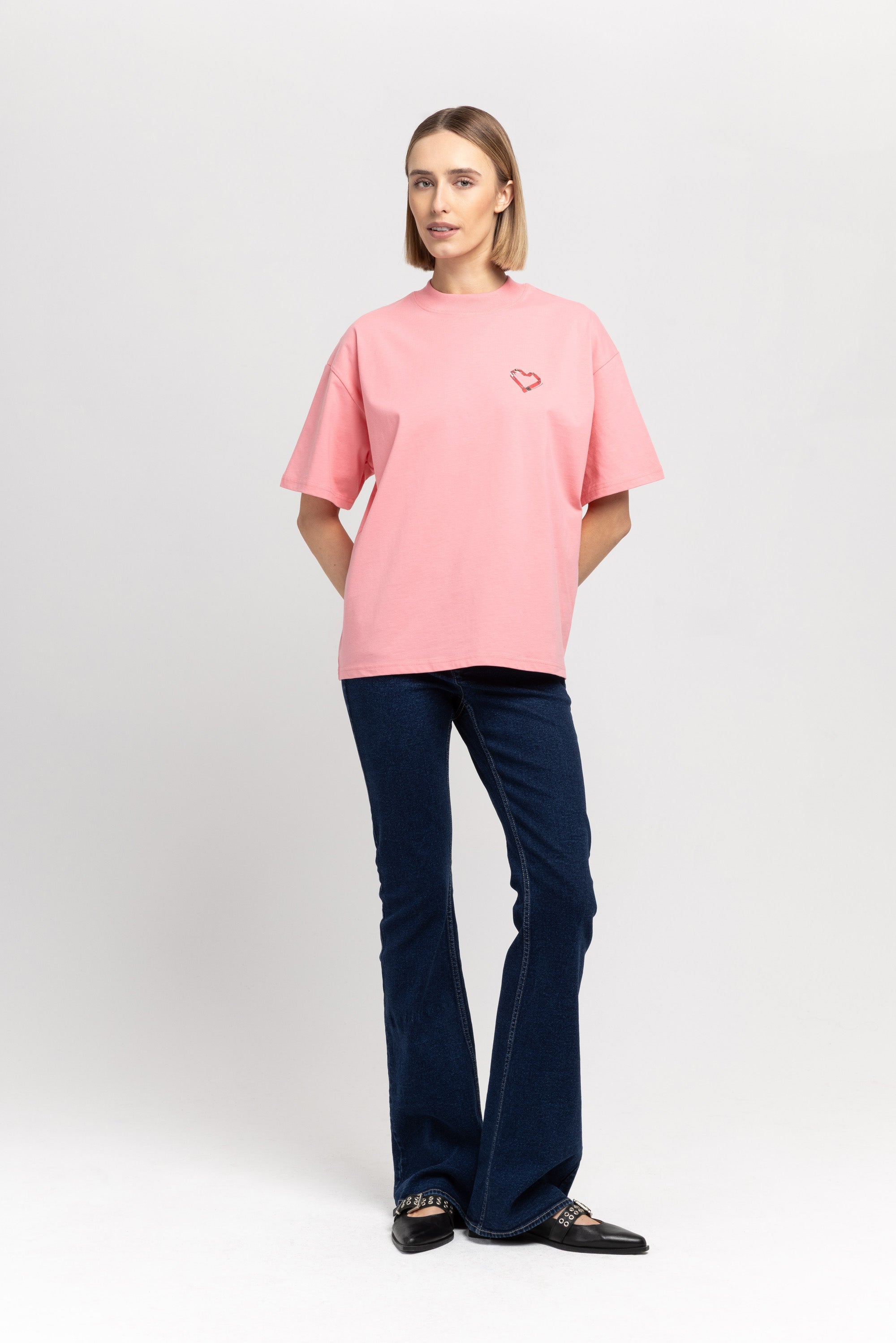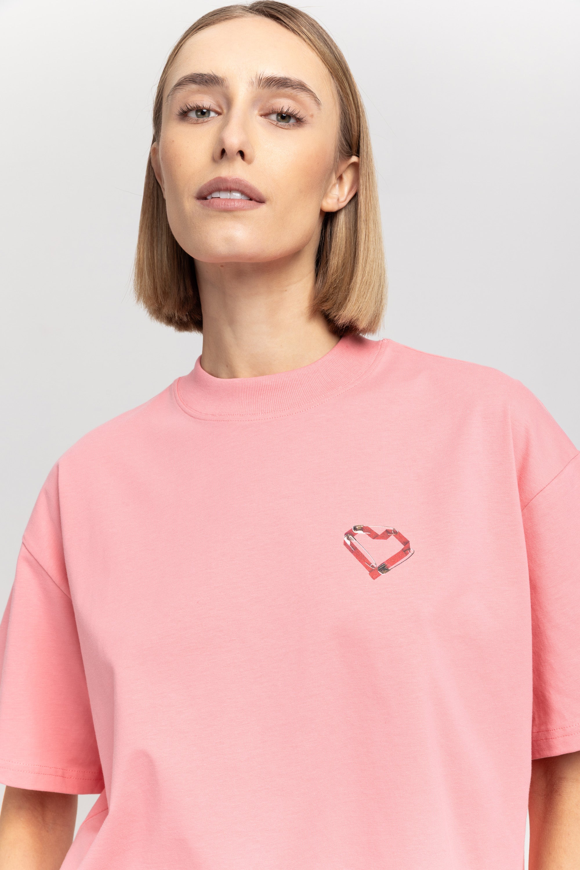 The TINO "VAL26" unisex t-shirt in flamingo pink cotton has a heart motif on the front referencing the language of design and NEHERA logo printed on the back.