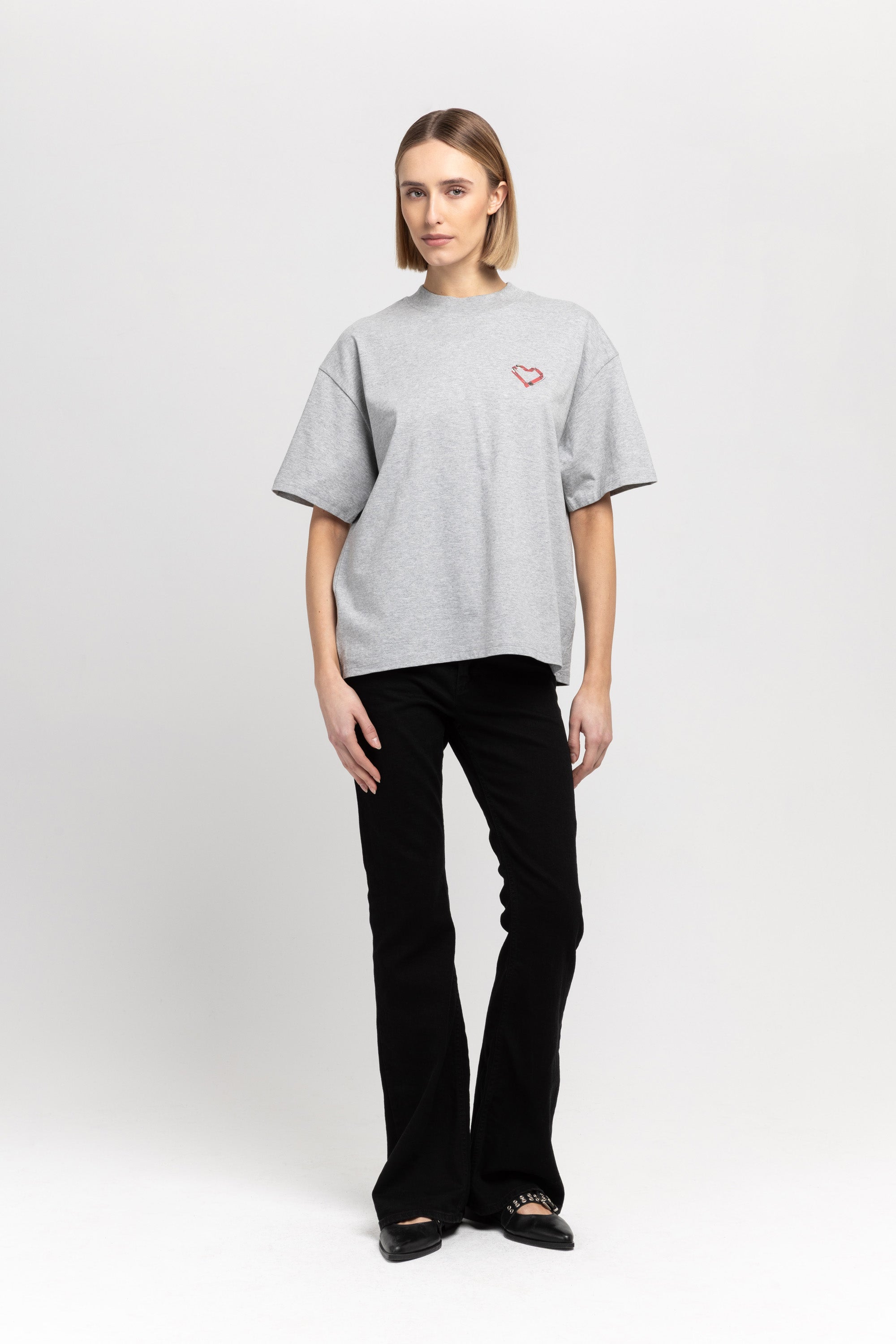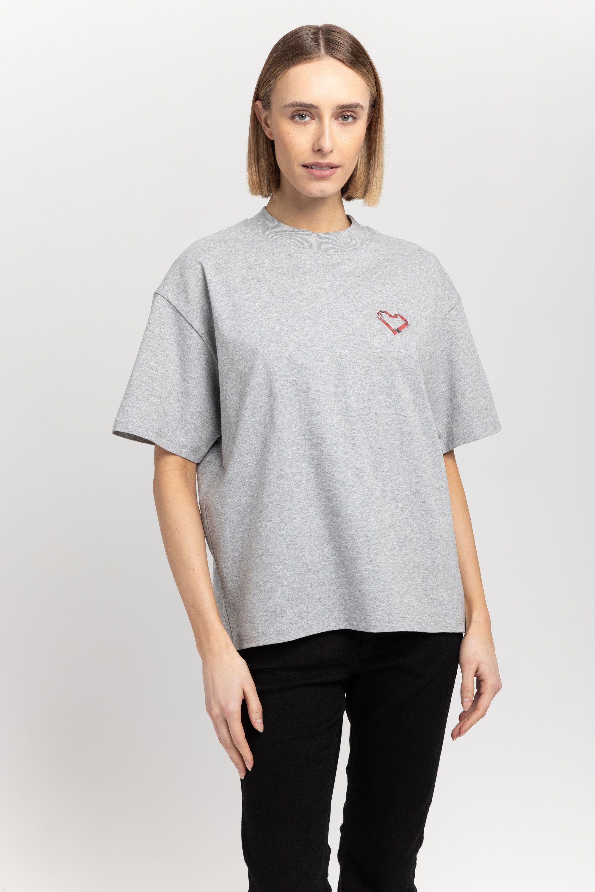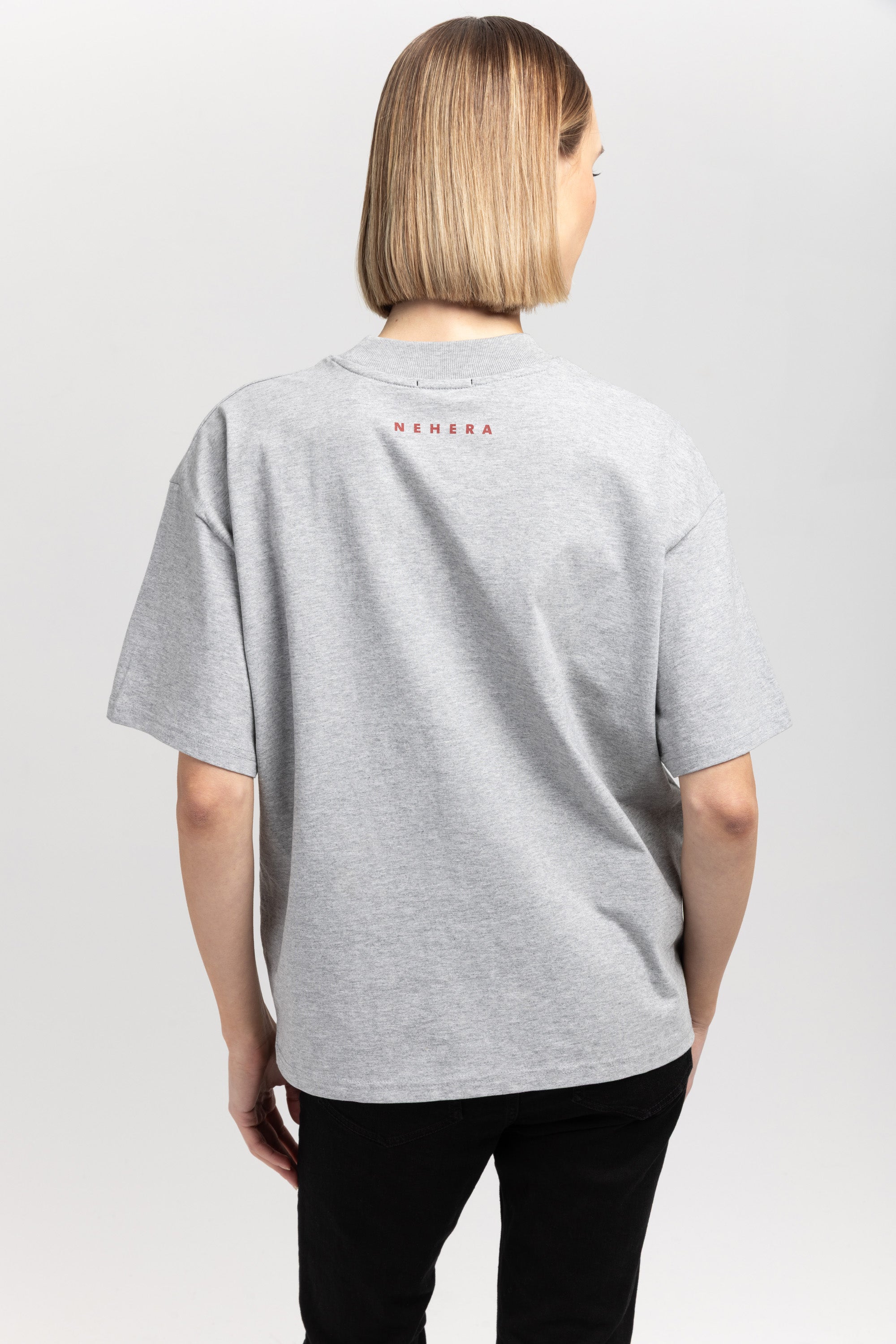 The TINO "VAL26" unisex t-shirt in grey melange pure cotton has a heart motif on the front referencing the language of design and NEHERA logo printed on the back.