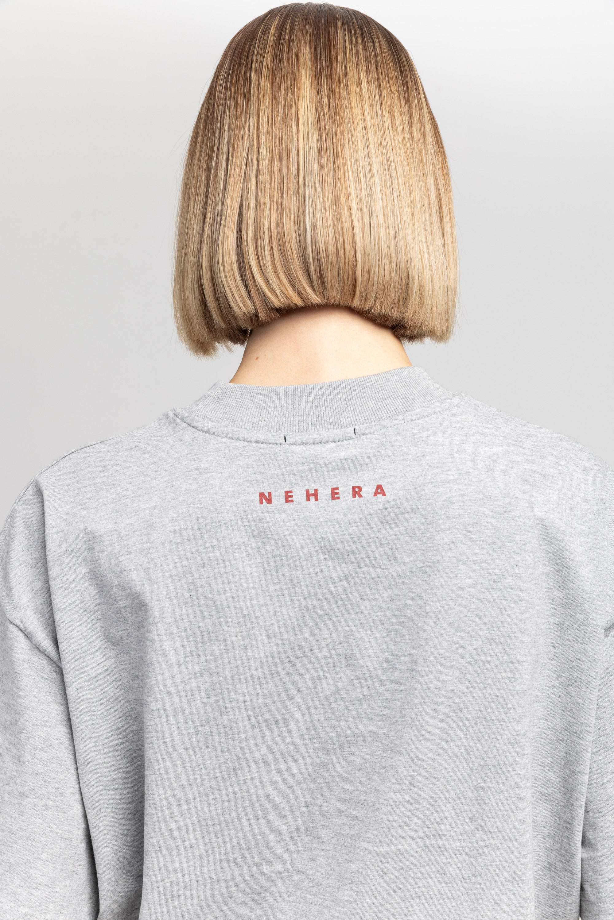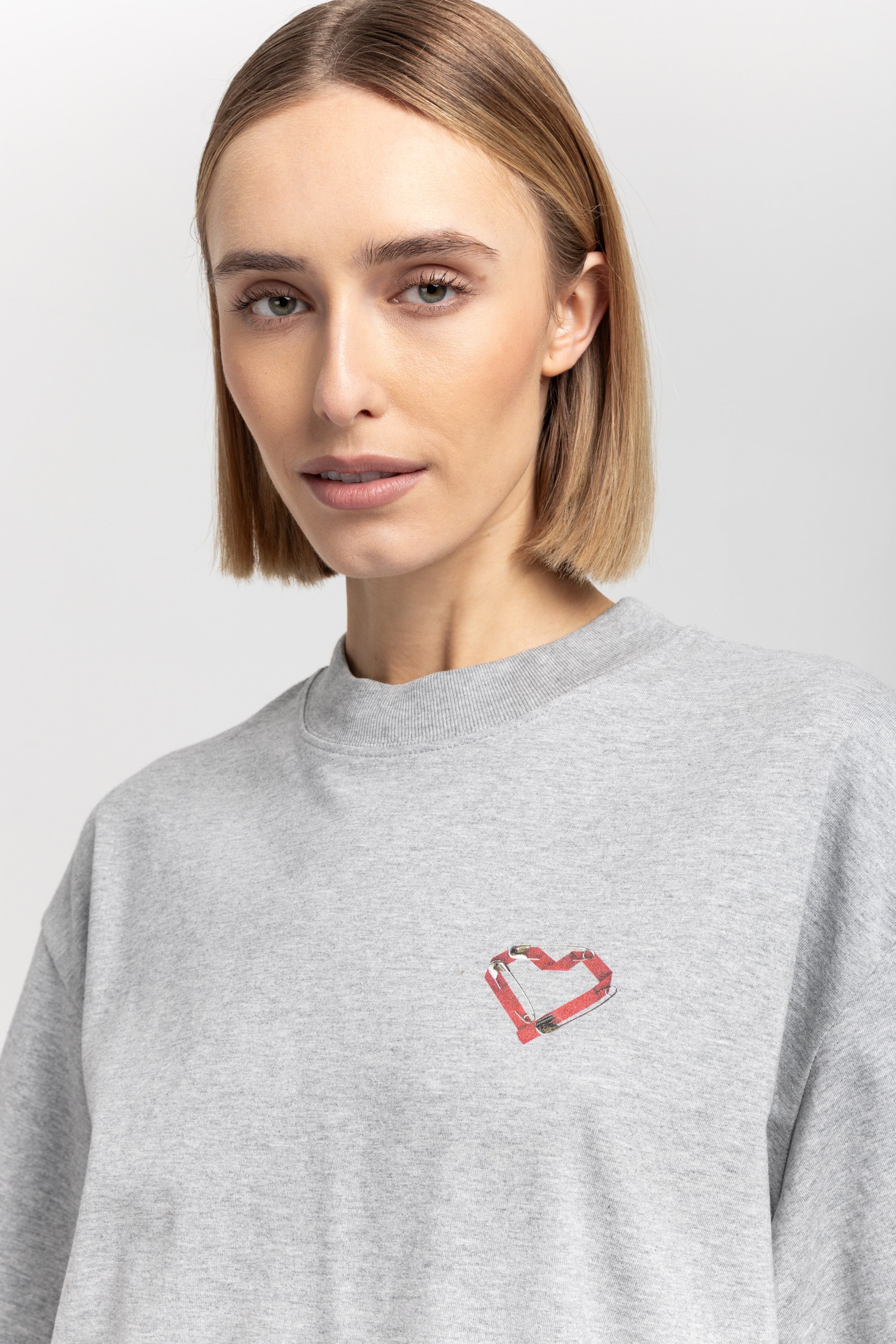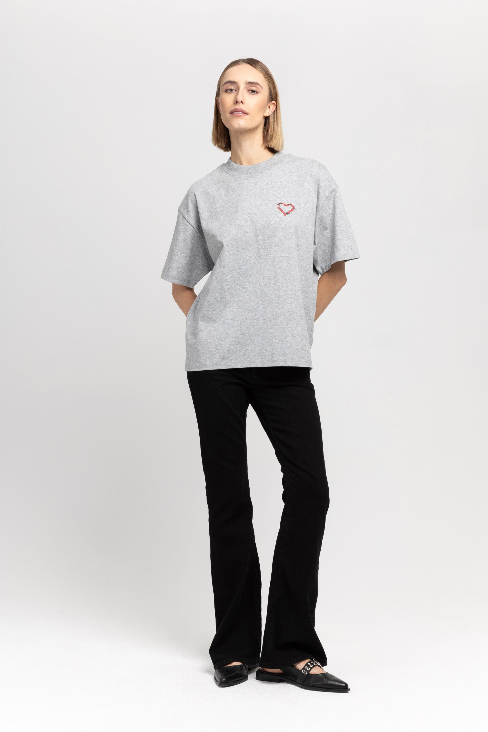 The TINO "VAL26" unisex t-shirt in grey melange pure cotton has a heart motif on the front referencing the language of design and NEHERA logo printed on the back.