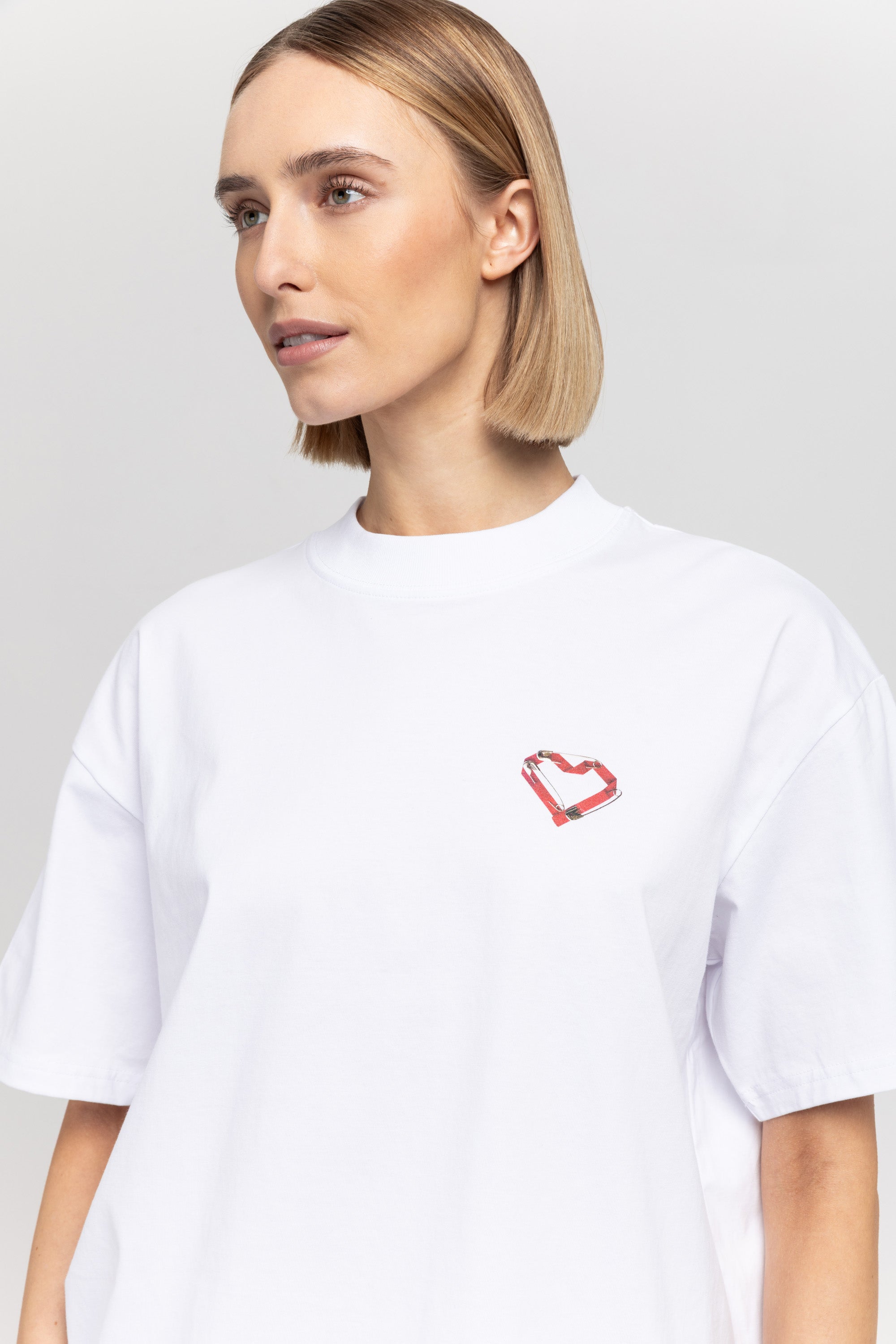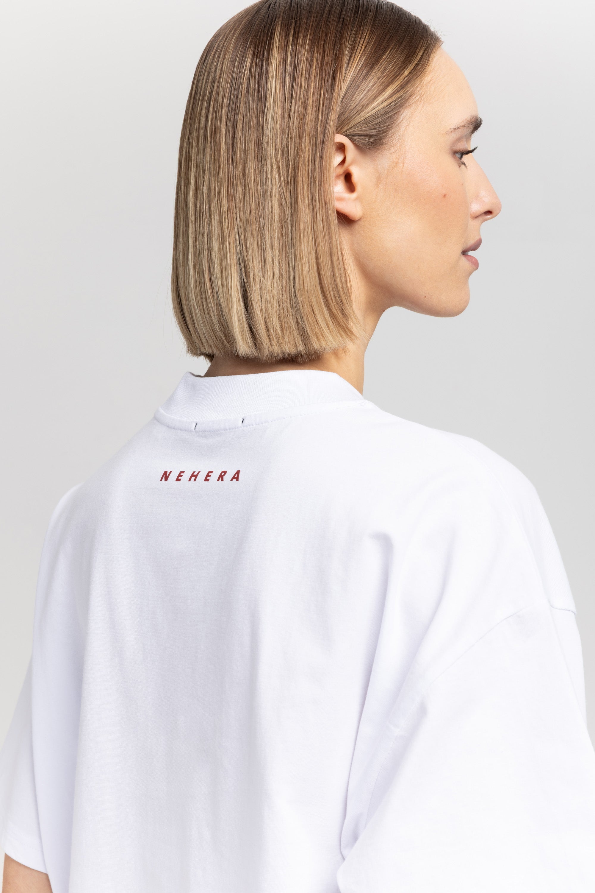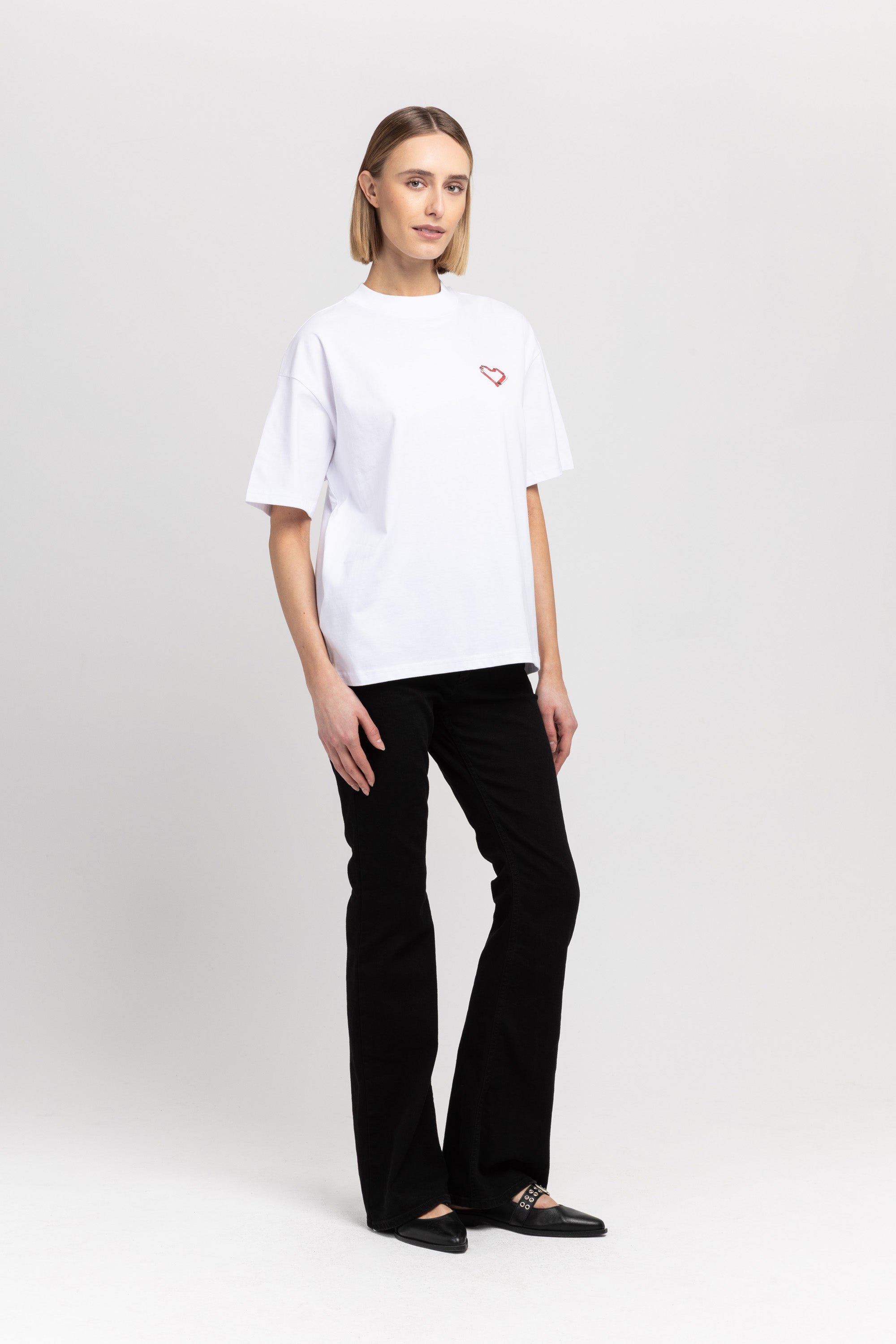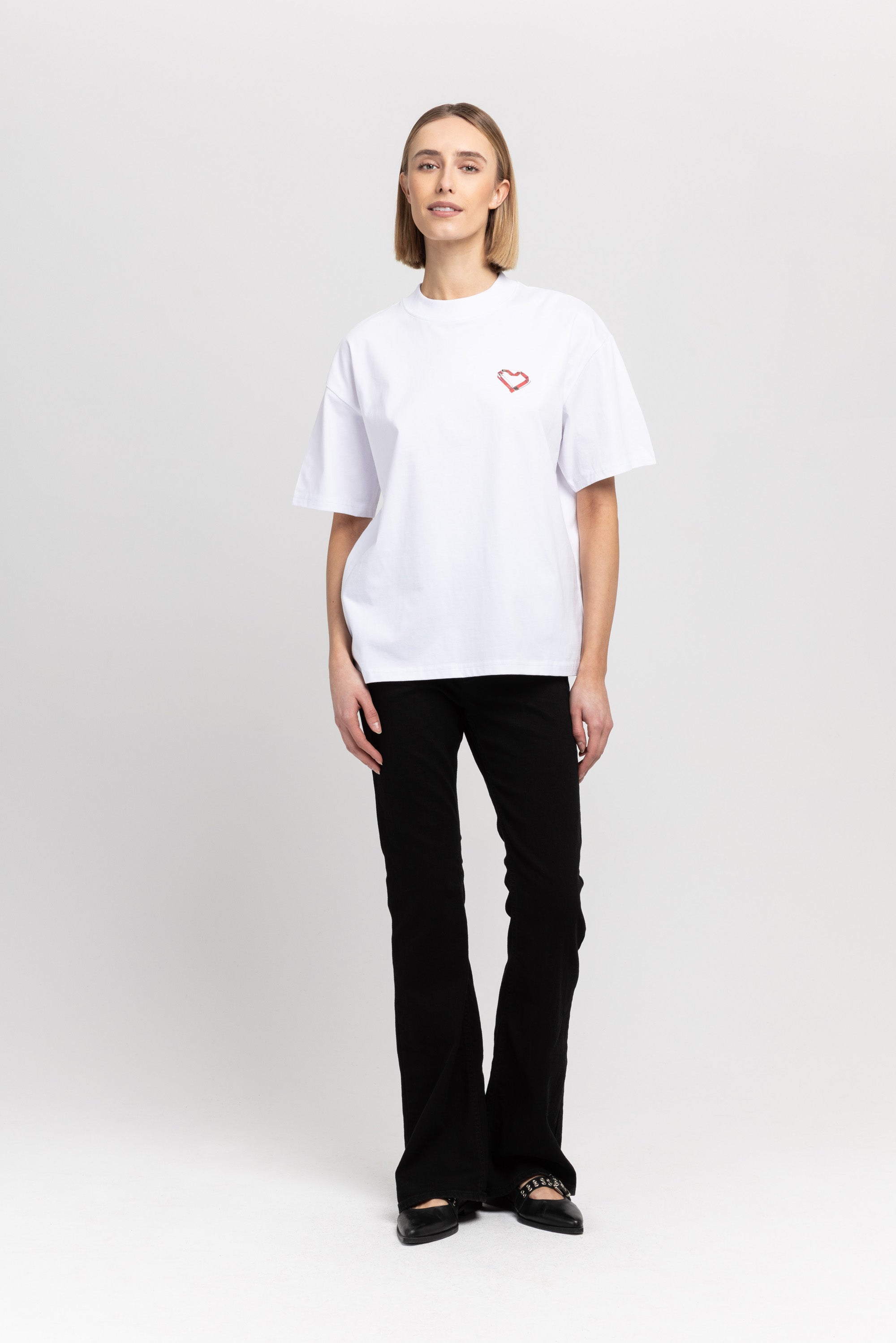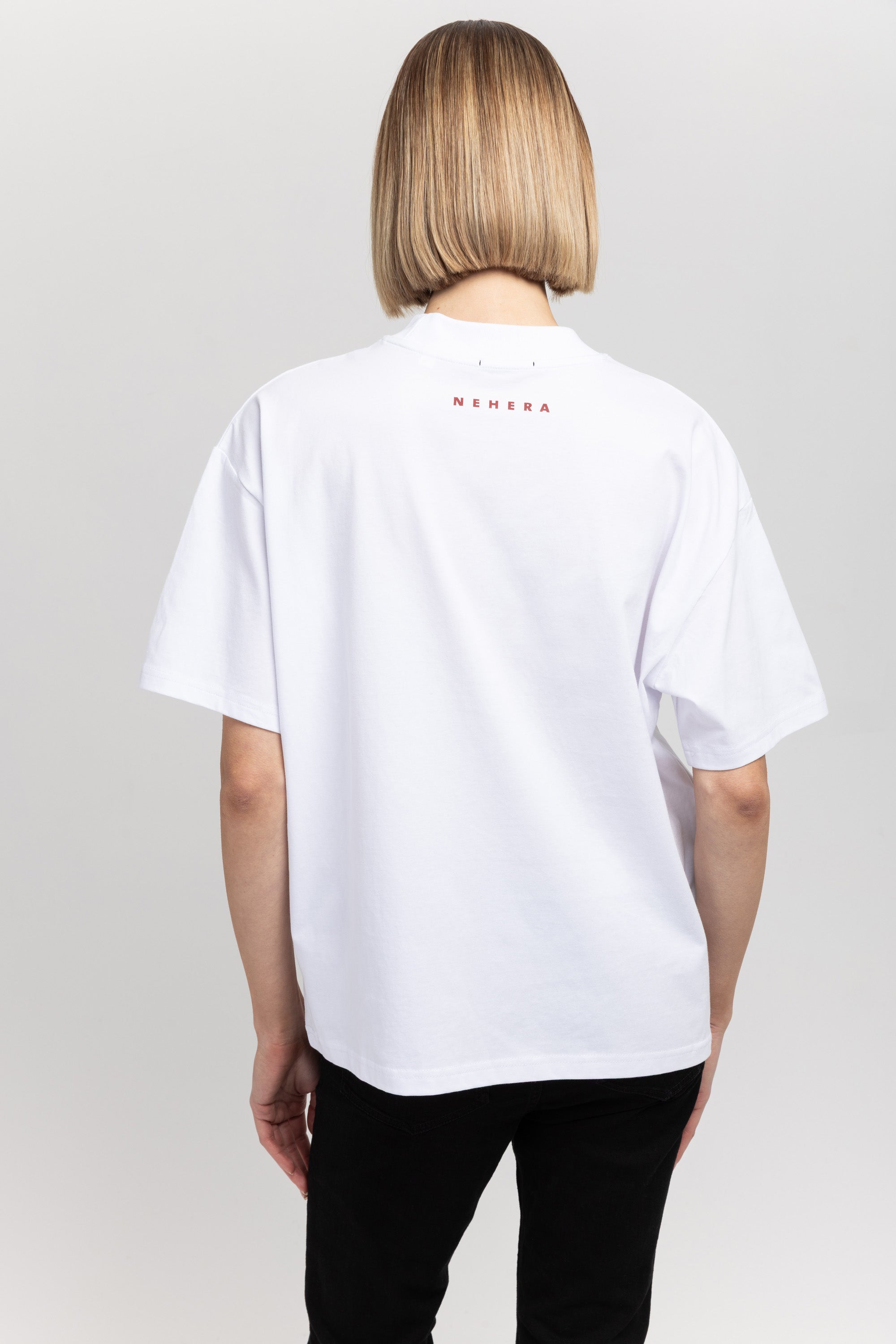 The TINO "VAL26" unisex t-shirt in white pure cotton has a heart motif on the front referencing the language of design and NEHERA logo printed on the back.