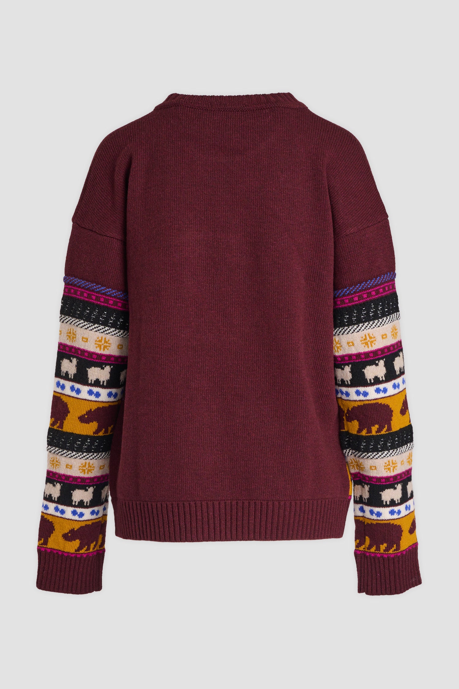 An elevated interpretation of a winter classic, this jacquard pullover is knitted from fine merino wool in a dark seasonal palette. It features a relaxed unisex silhouette and intricate woven motifs inspired by the wilderness.