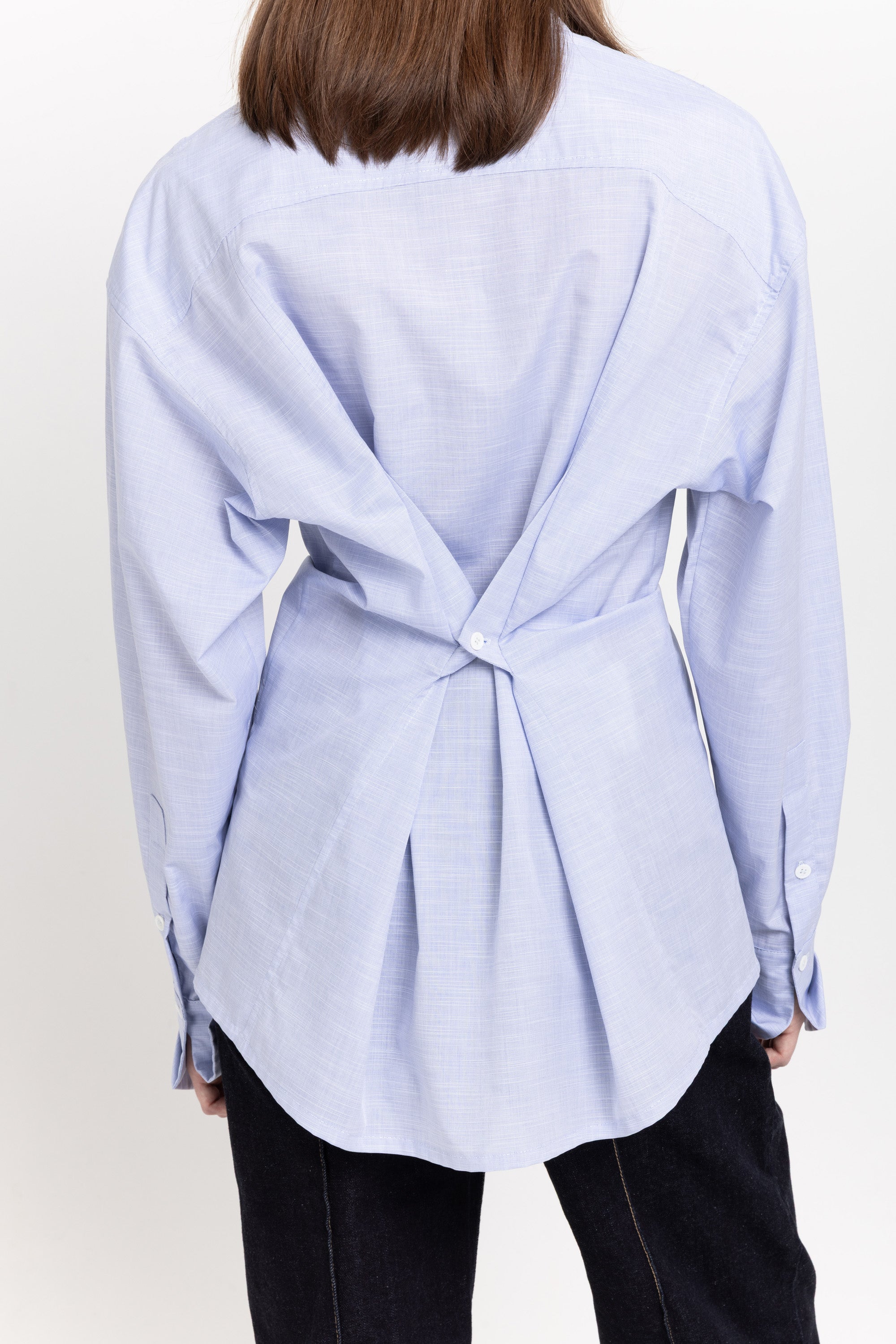 BENJI shirt in subtle blue poplin, cut to a straight fit with a wrap hem that cinches at the front and back to create a flattering, sculpted silhouette.