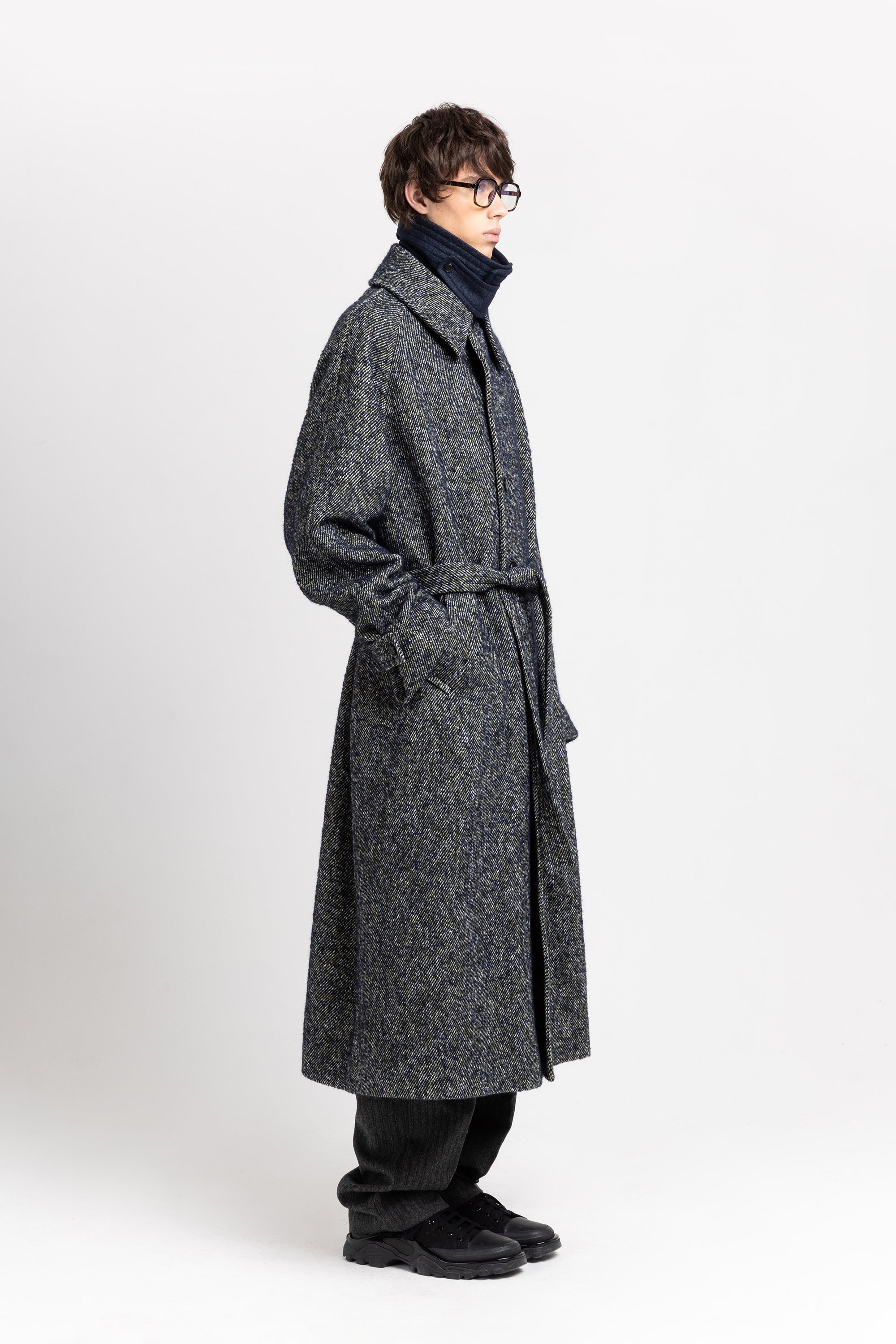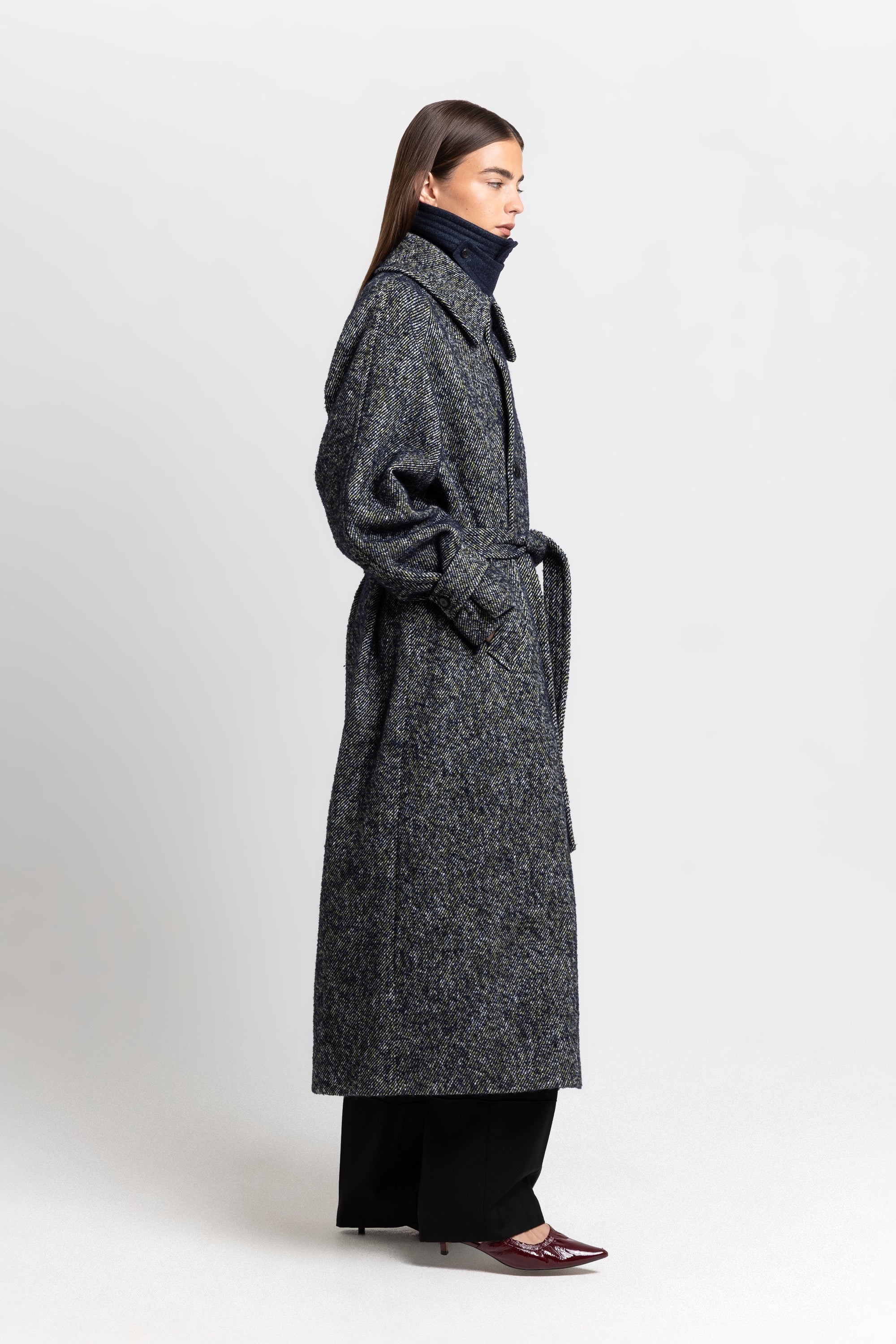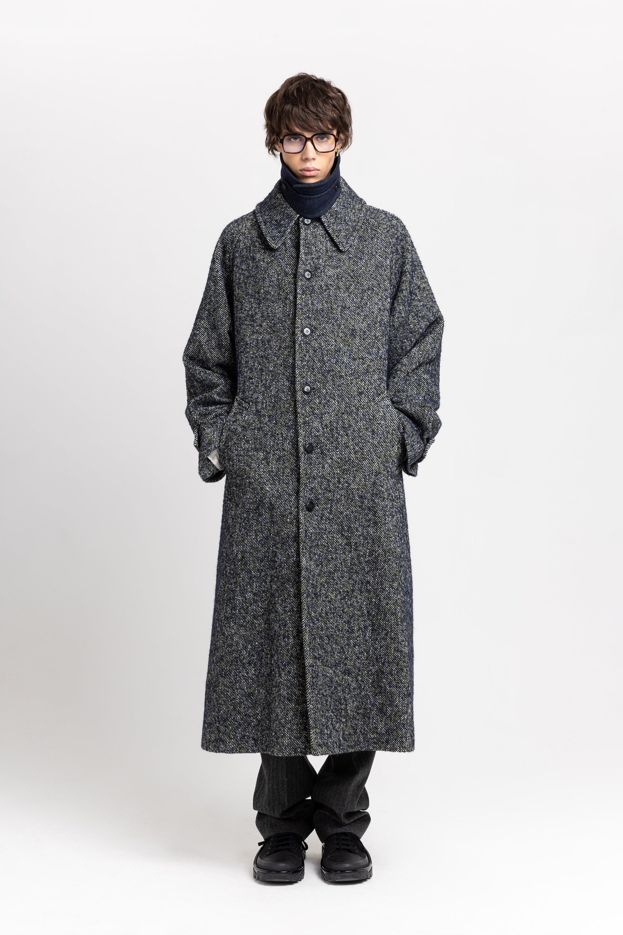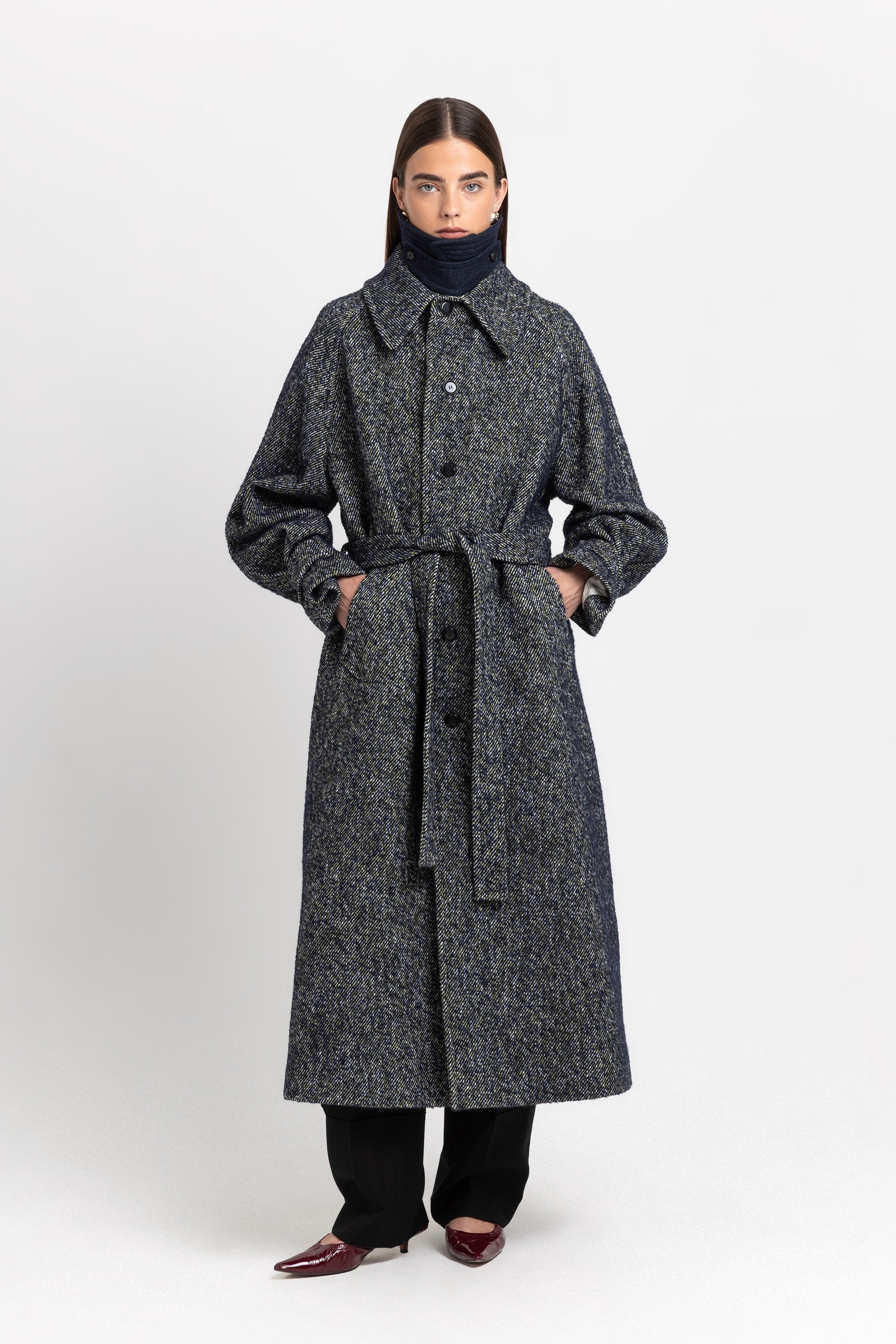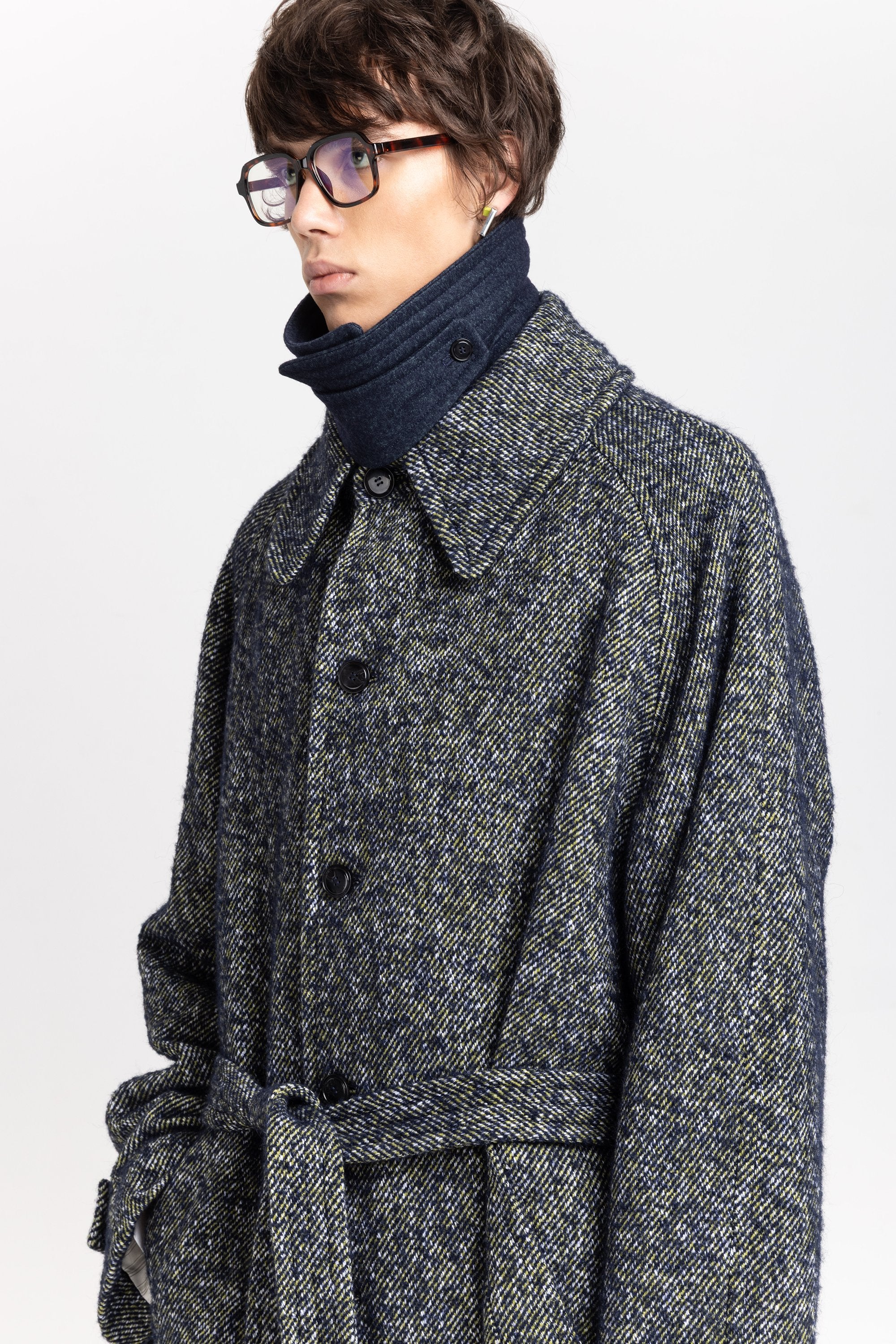The COMMETA is a tailored longline coat crafted from a textured navy and green wool-blend twill. Designed with a structured silhouette, it features a distinctive double collar, concealed placket, and side pockets for a clean, architectural finish. A genderless staple for transitional layering.