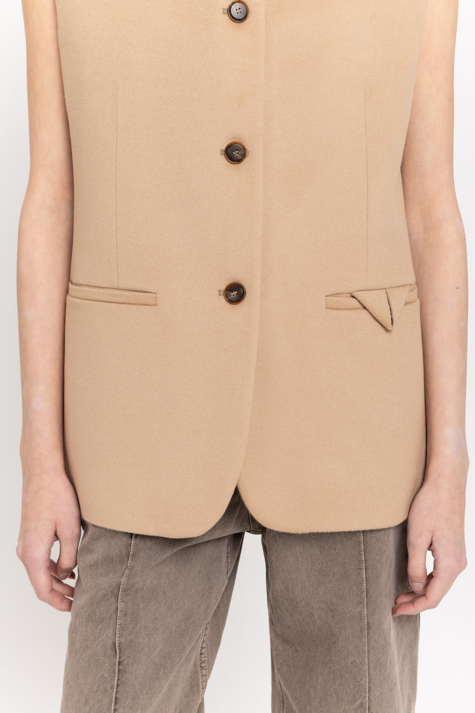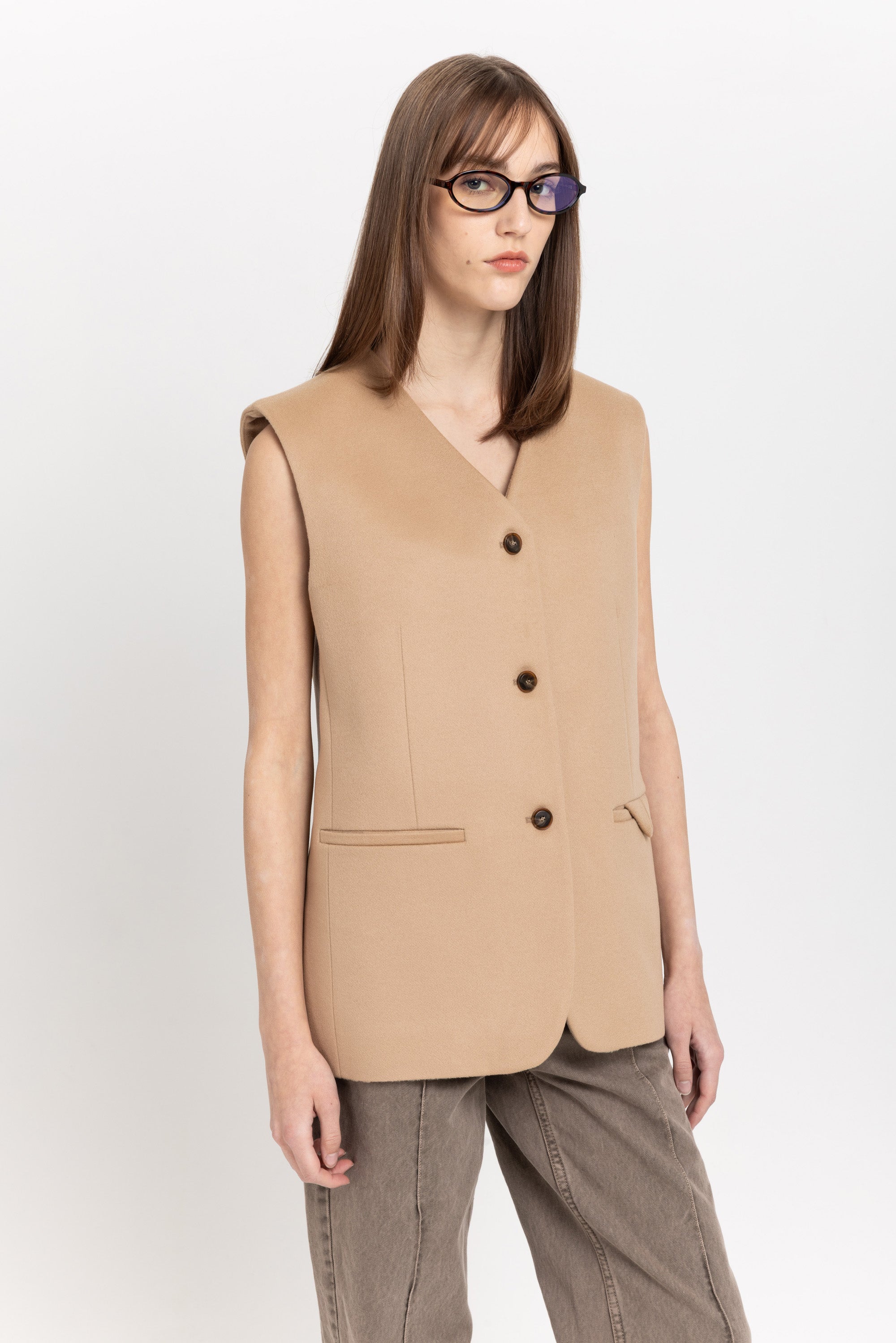 JORGANA tailored vest in an oatmeal wool-cashmere blend. Defined by its fitted silhouette and refined tailoring, it layers effortlessly under our CORALIA coat or stands alone for a polished, modern look.