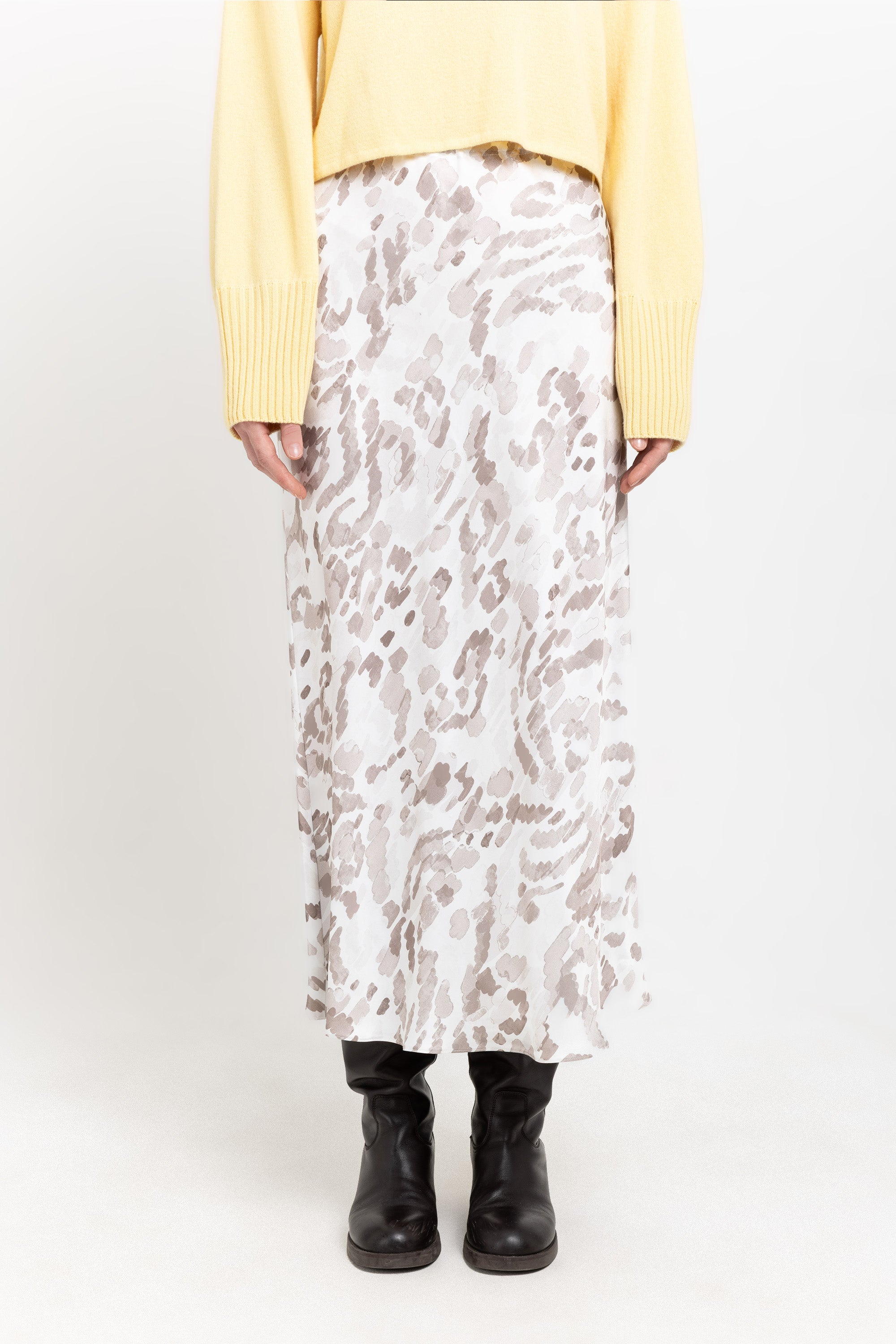 The SIBYLIA is a mid-length skirt in fluid printed viscose, featuring a watercolor motif and an easy pull-on design. Effortless movement with a refined finish.