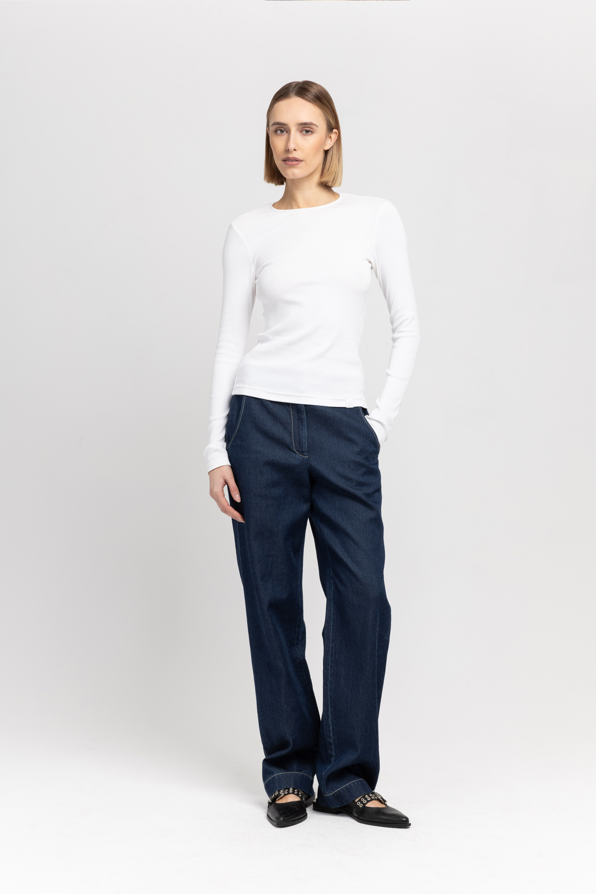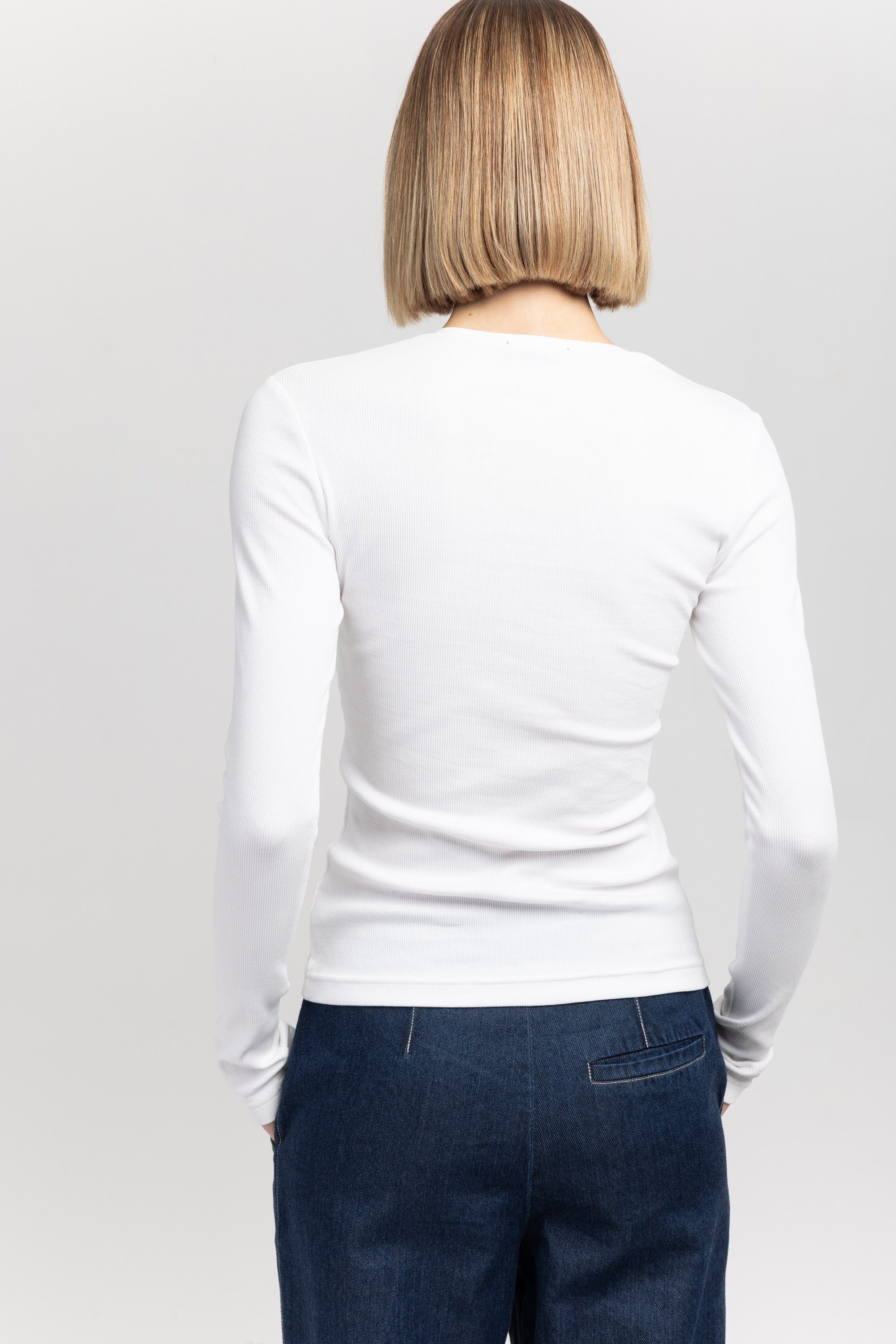 The TANEA top is made in a fine organic cotton rib that offers gentle structure and a tighter silhouette. Its long sleeves and off-white palette make it a versatile year-round staple, thoughtfully finished with our heritage N logo placed subtly along the hemline.