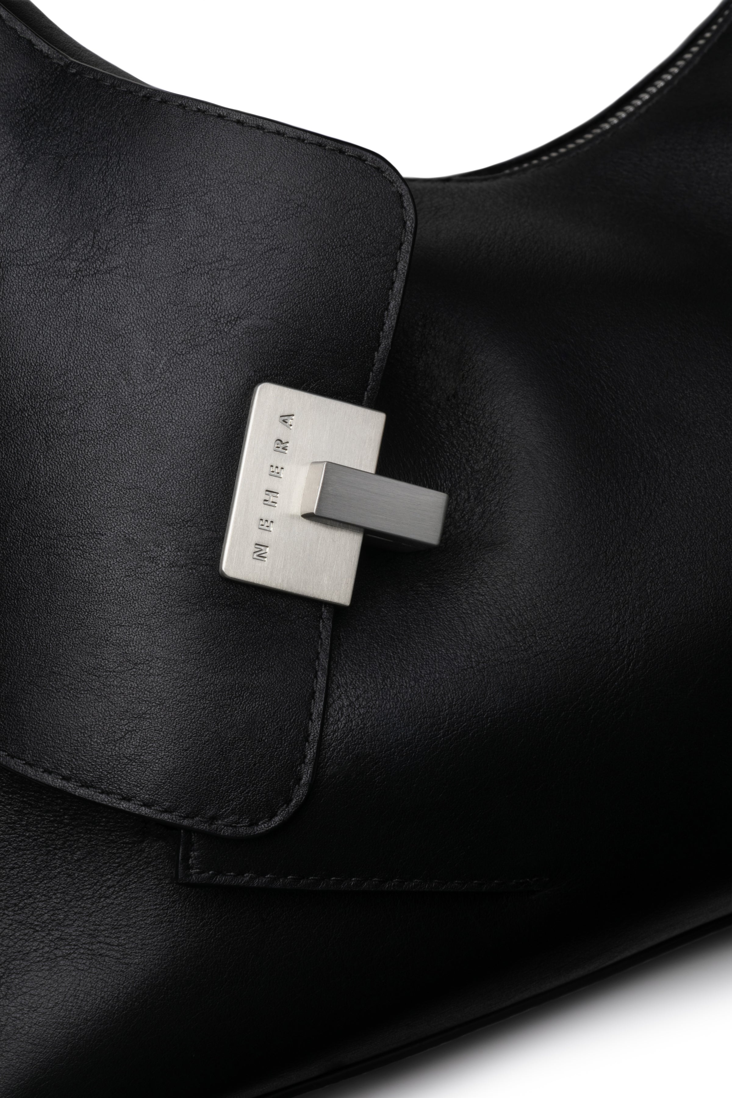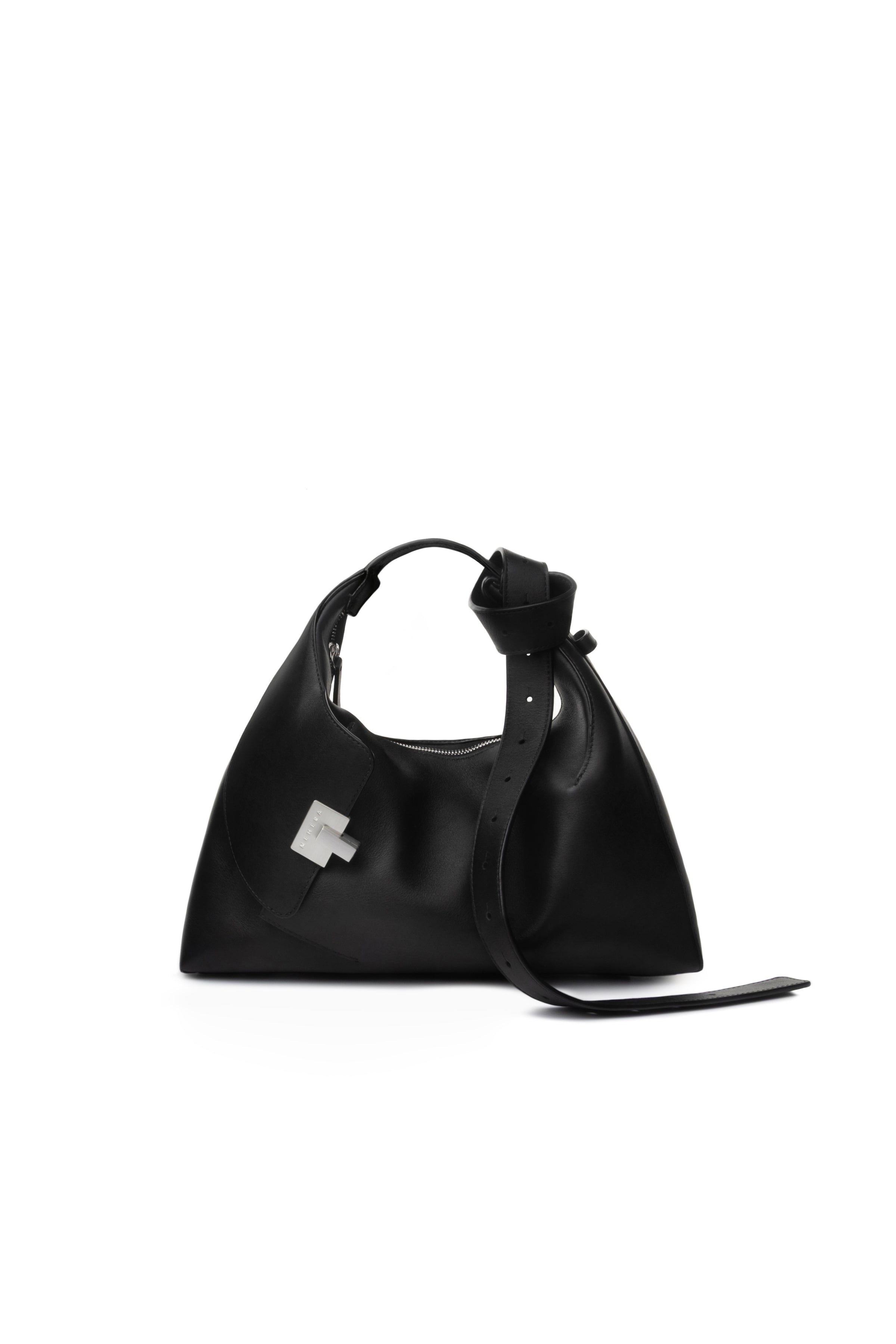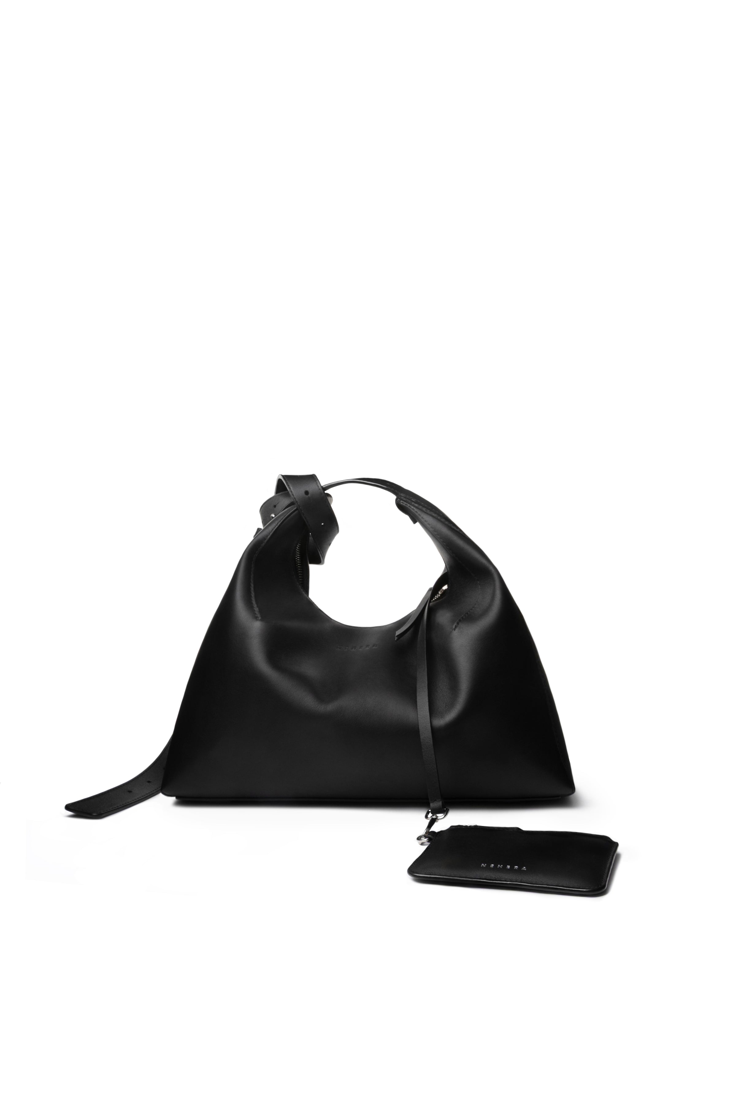 The Tilda Bag is a sculptural leather handbag defined by a distinctive knotted strap and refined detailing. It can be worn in three ways: as a shoulder bag, crossbody, or handheld. The design features a detachable zippered pouch and a front pocket with a metal closure lock.