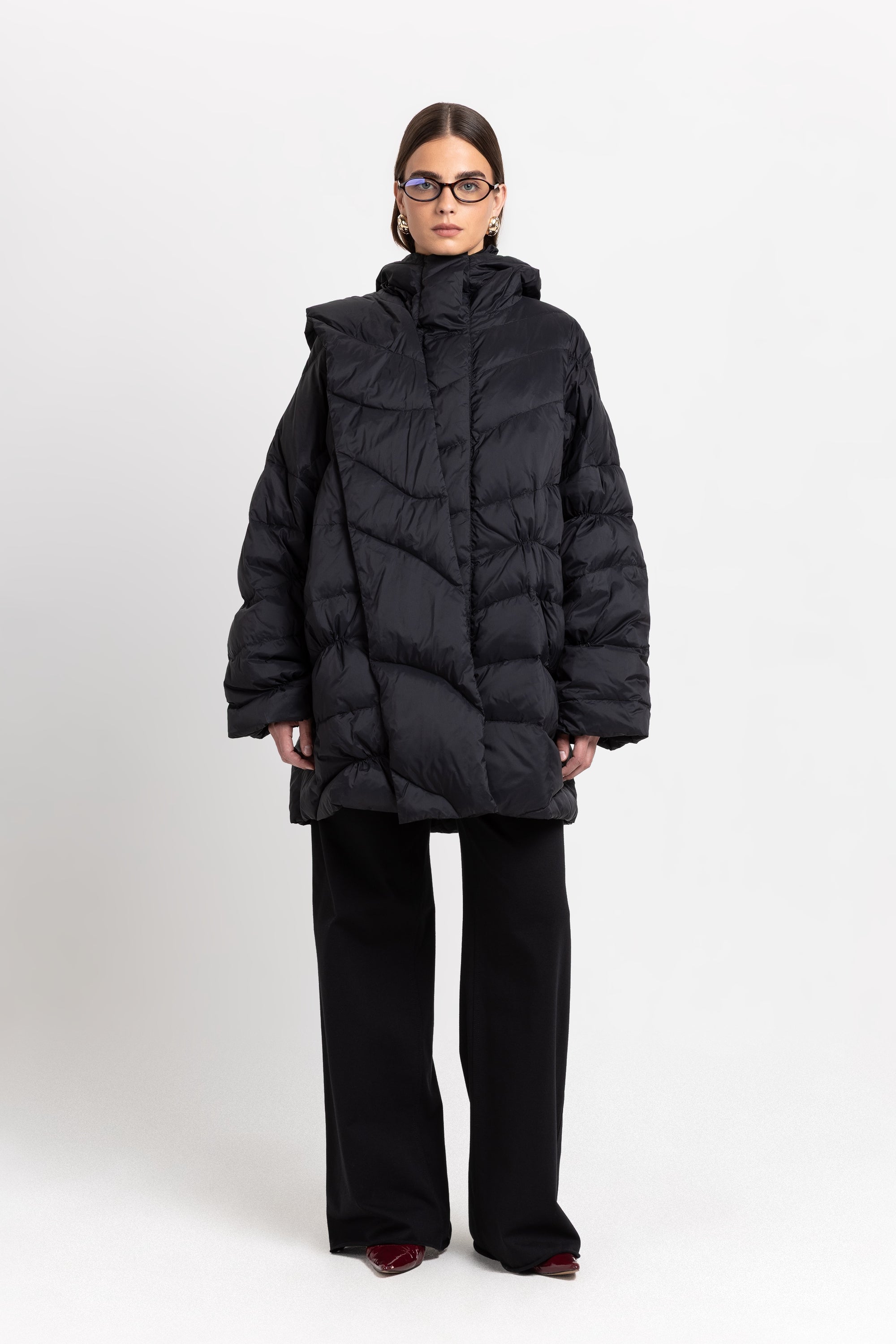 A sculptural down coat in black, crafted from a soft-touch technical shell. The CATRION coat is designed with exaggerated volume and an integrated detachable padded scarf that drapes fluidly over the shoulder, offering both warmth and visual impact. Wear open or wrapped to transform the silhouette - an expressive outerwear piece with modular appeal.