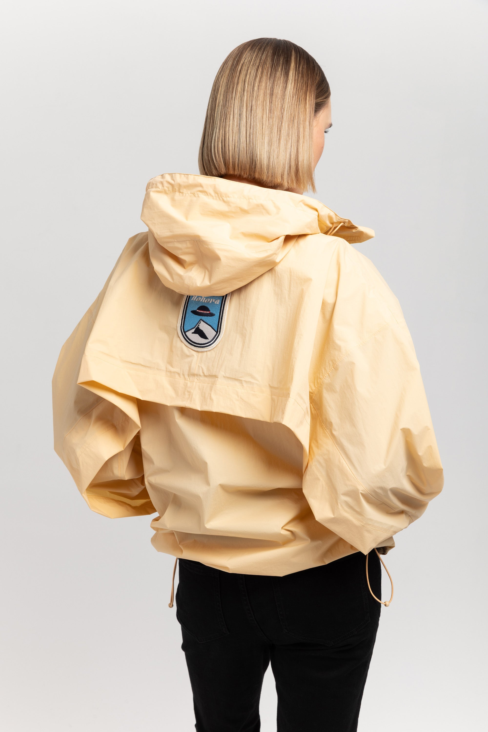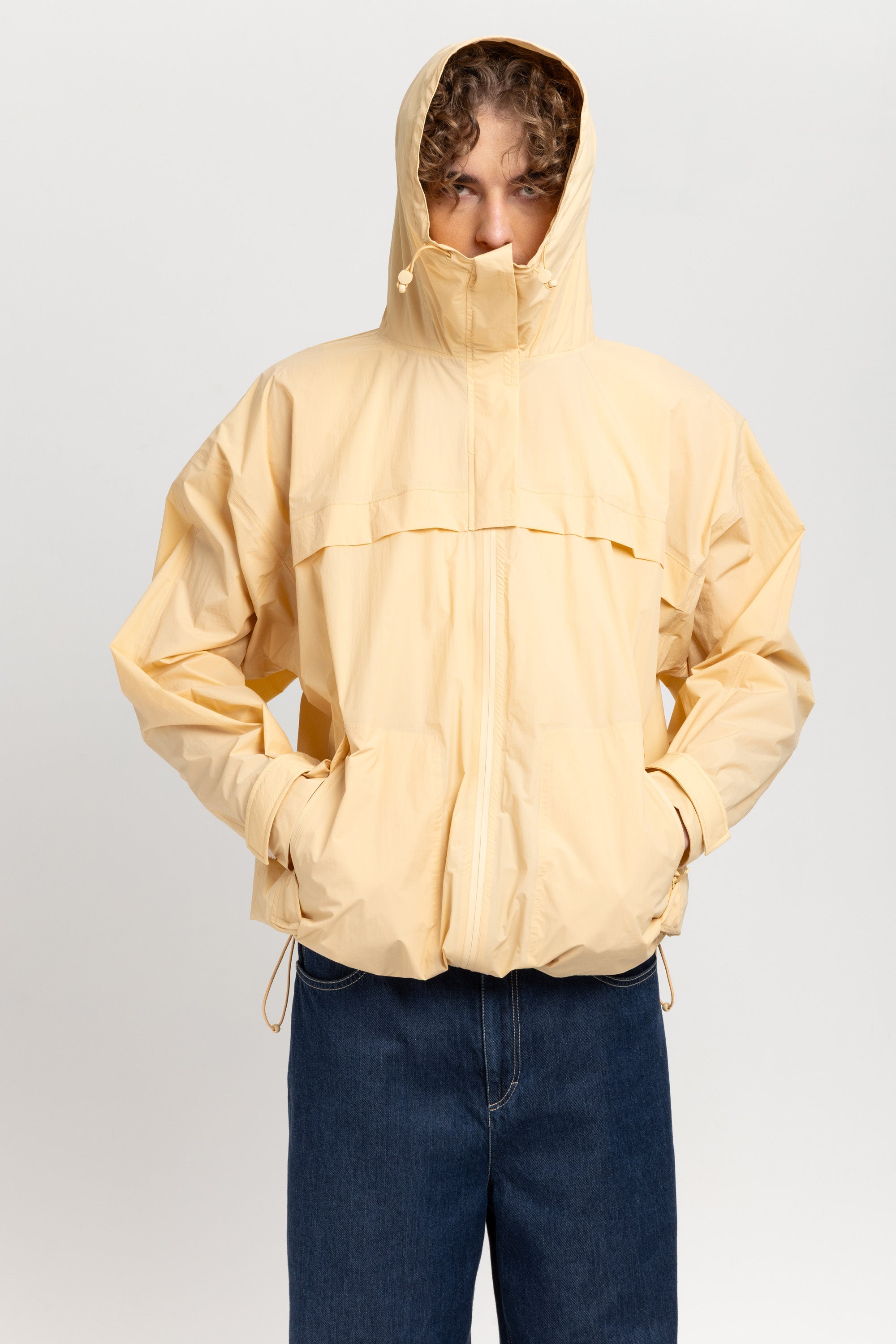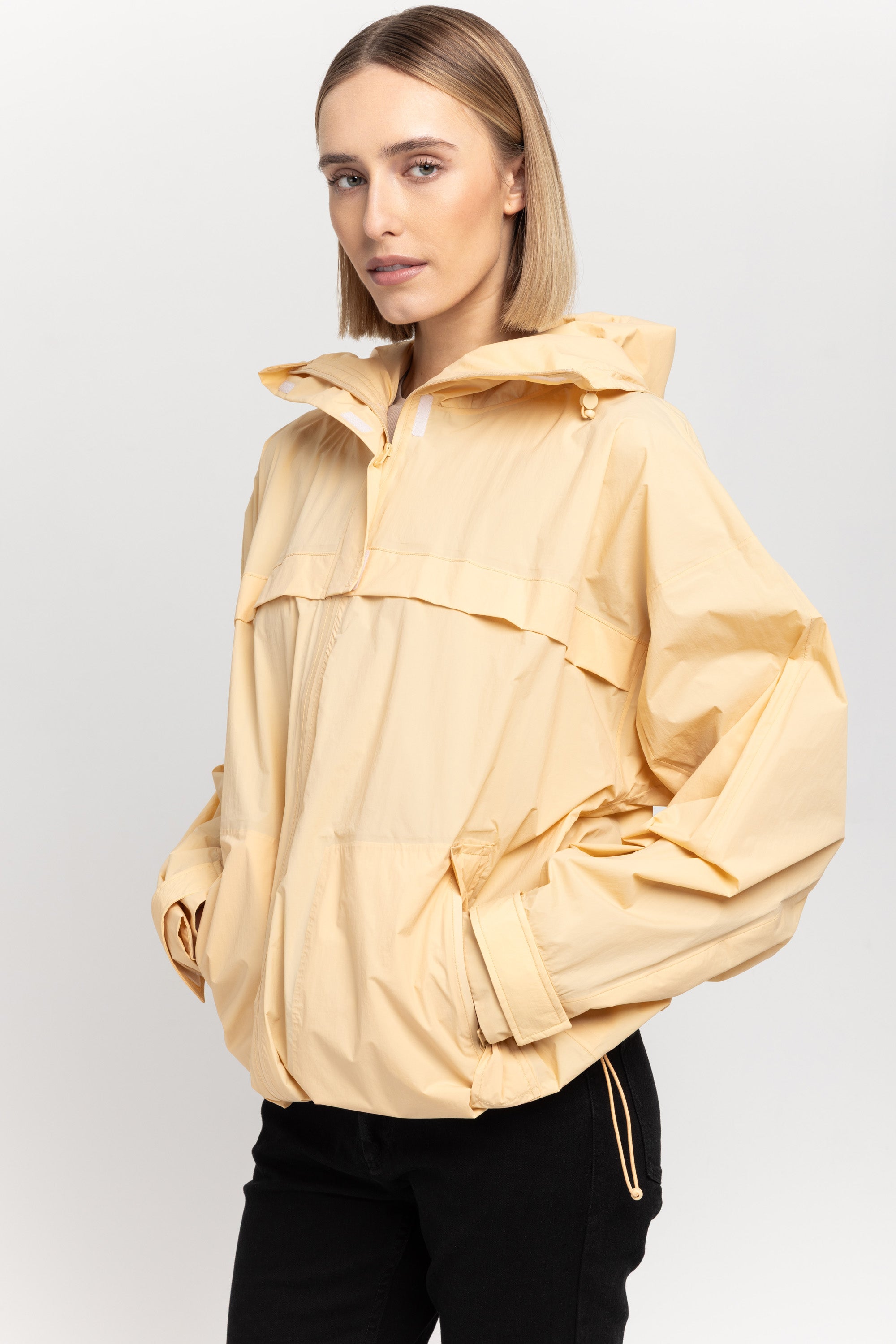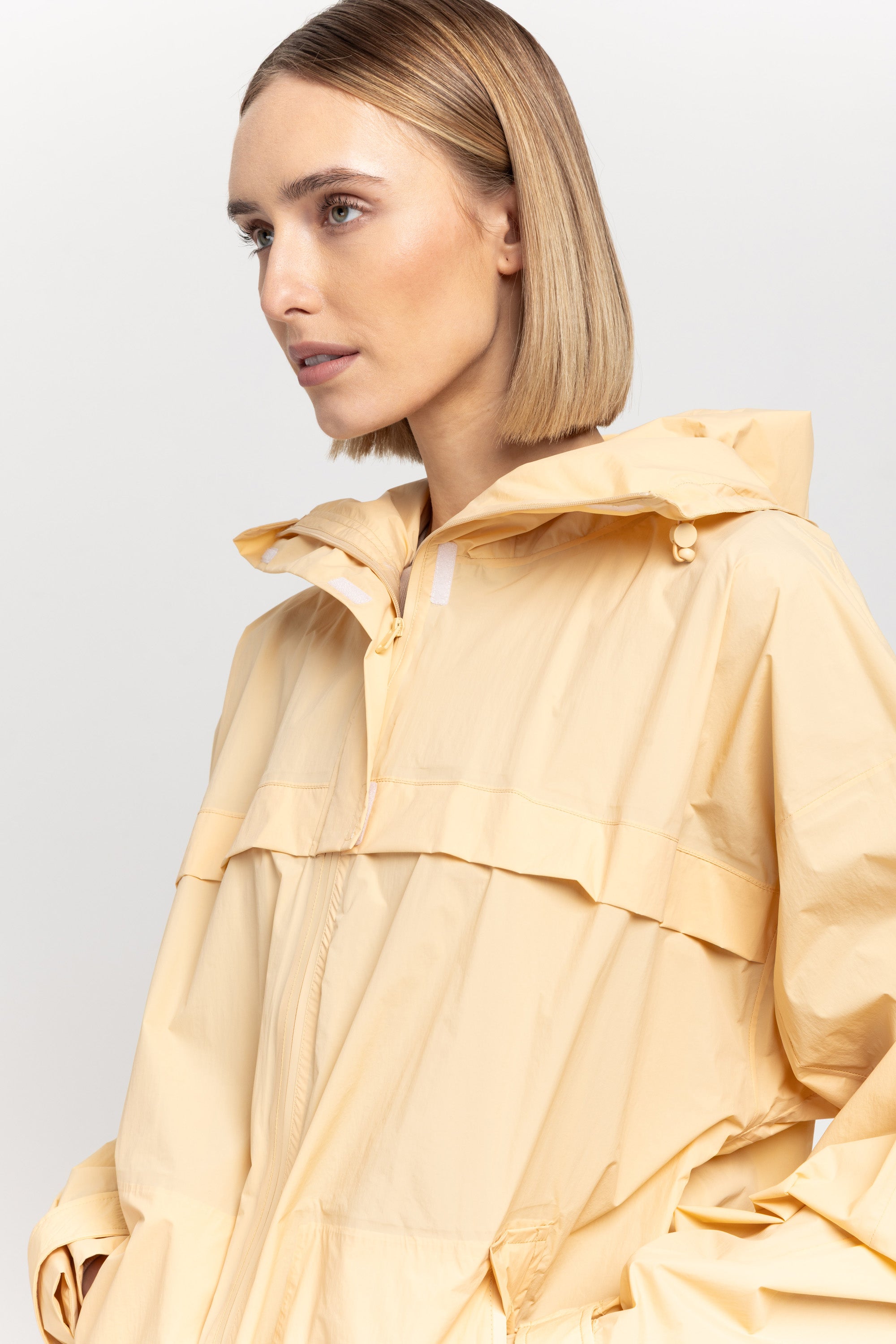 CERLA is a unisex butter beige anorak, fully waterproof with internal taped seams. Thoughtfully designed with a covered top zipper, sealed and adjustable cuffs and hem, and covered pockets. Durable, effortless, ready for rain.