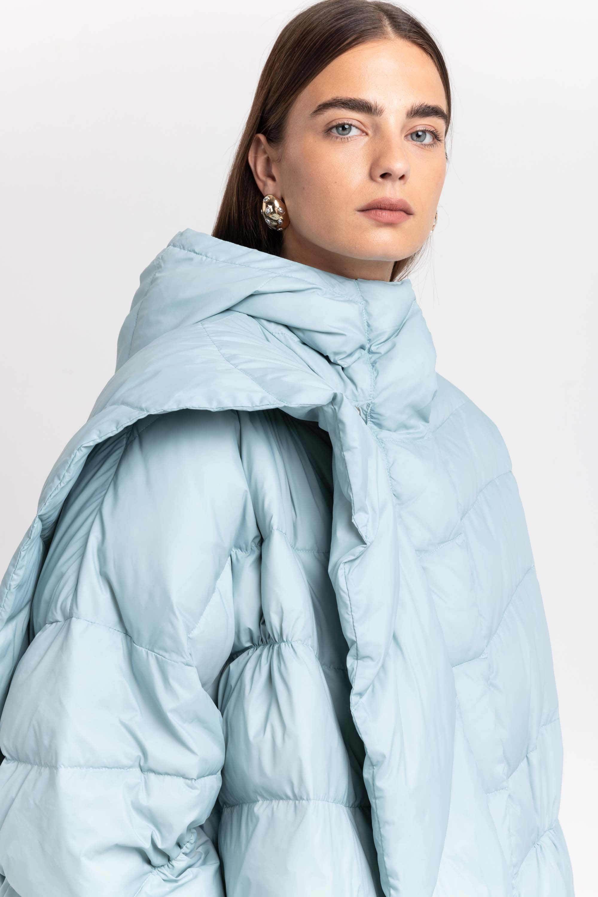 A sculptural down coat in dusty blue, crafted from a soft-touch technical shell. The CATRION coat is designed with exaggerated volume and an integrated detachable padded scarf that drapes fluidly over the shoulder, offering both warmth and visual impact. Wear open or wrapped to transform the silhouette - an expressive outerwear piece with modular appeal.