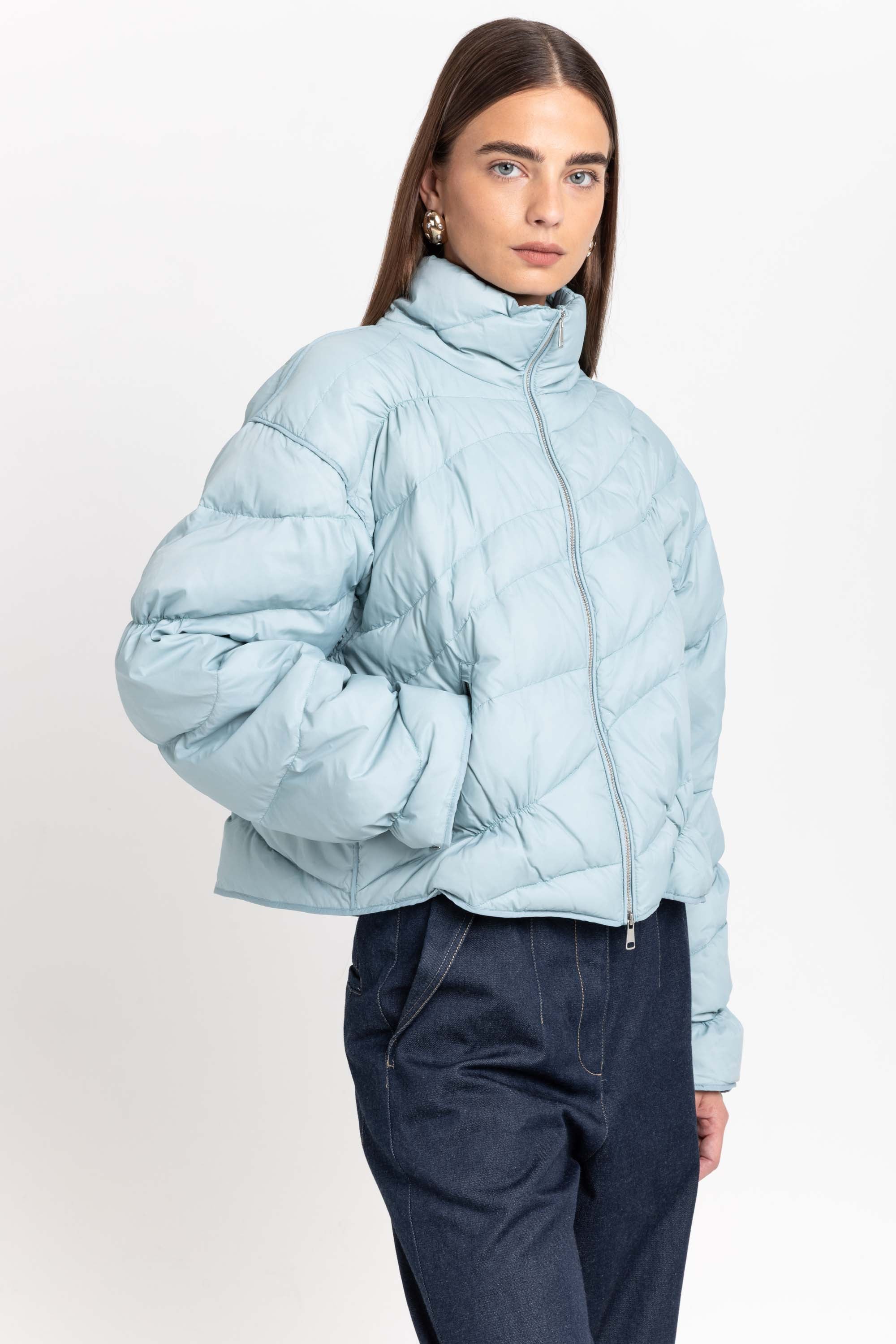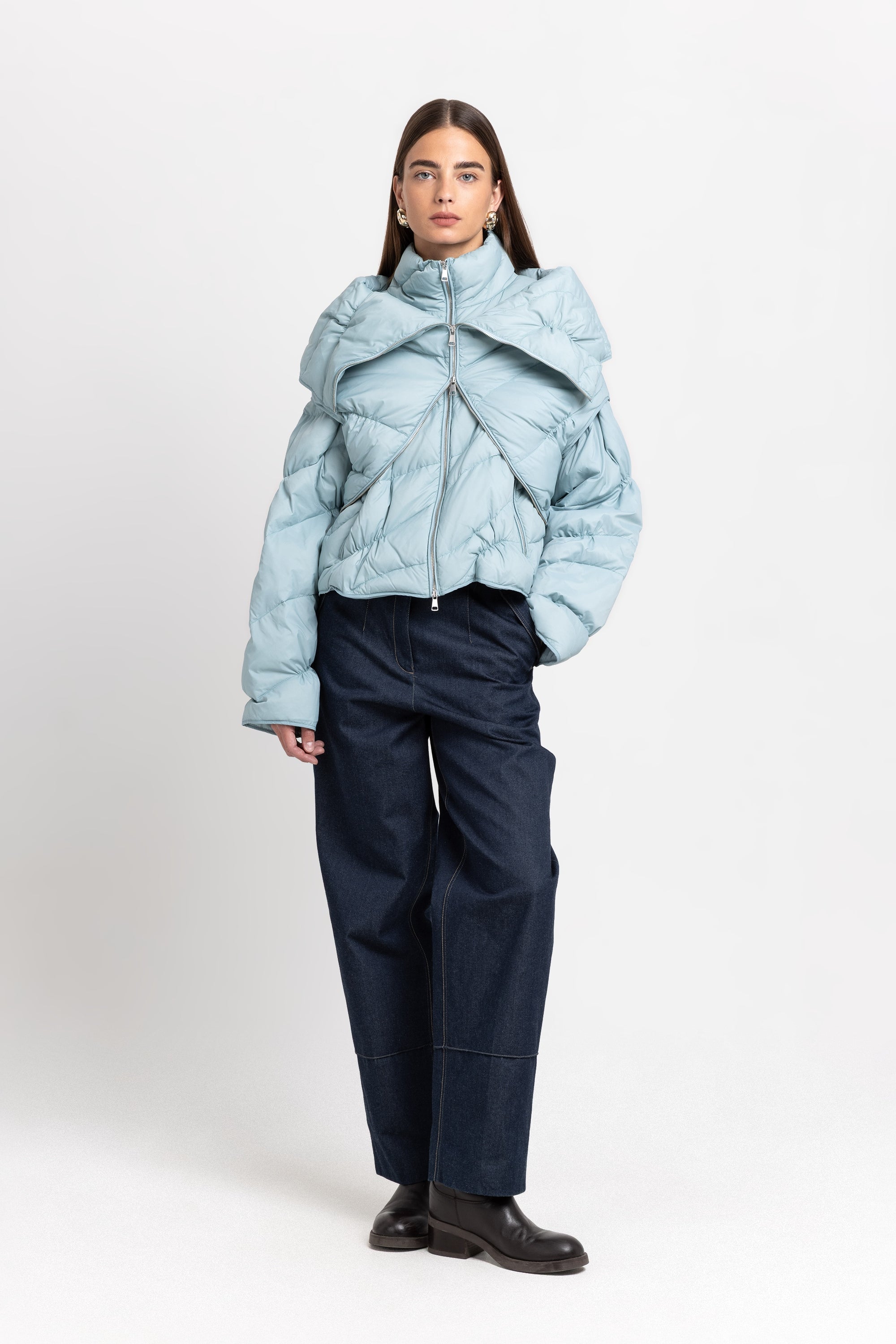 An architectural down coat crafted from soft-touch technical shell in a dusty blue hue. The CORRIE is defined by its sculptural silhouette and voluminous folds, it can be styled multiple ways thanks to an adjustable zip closure and modular construction.