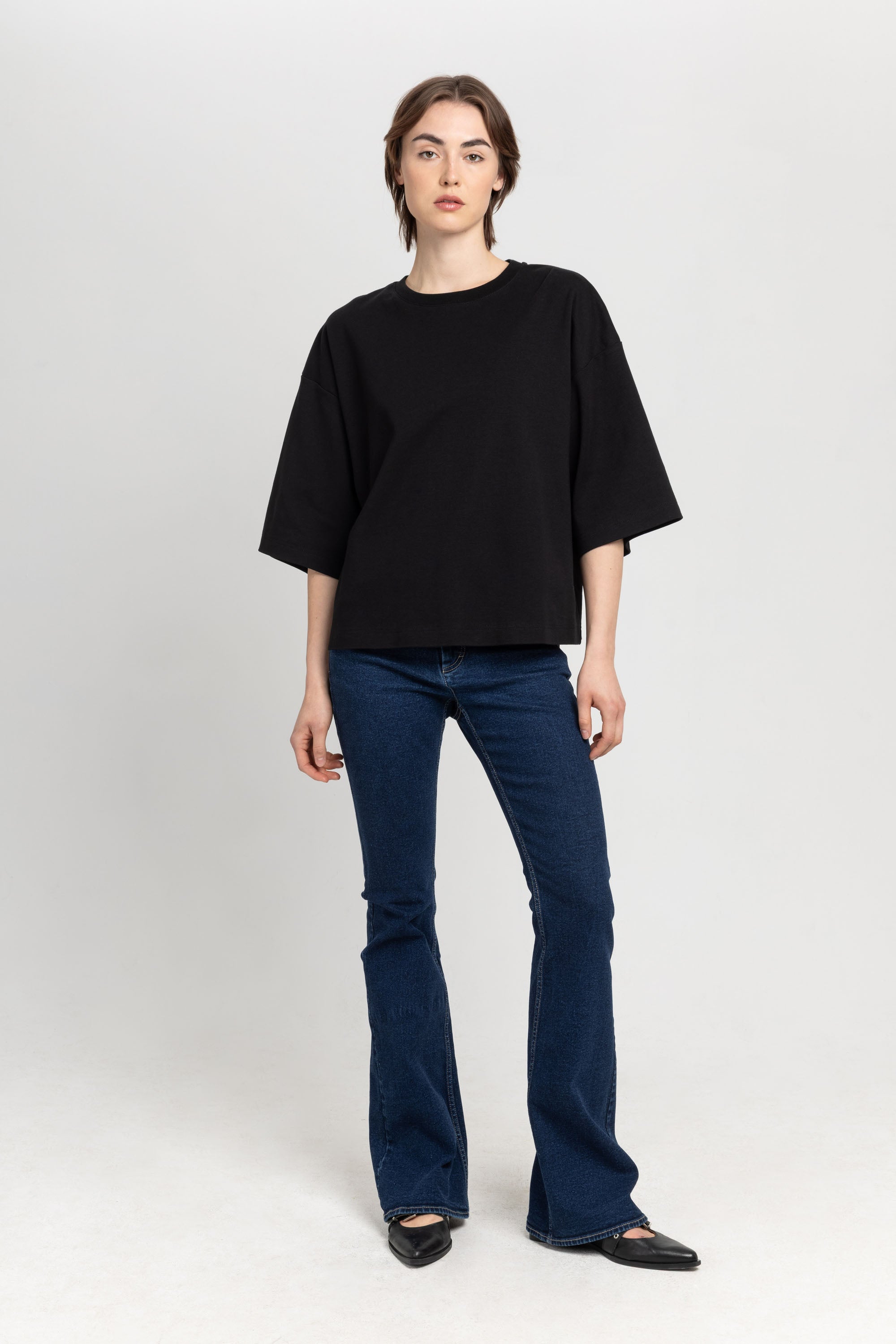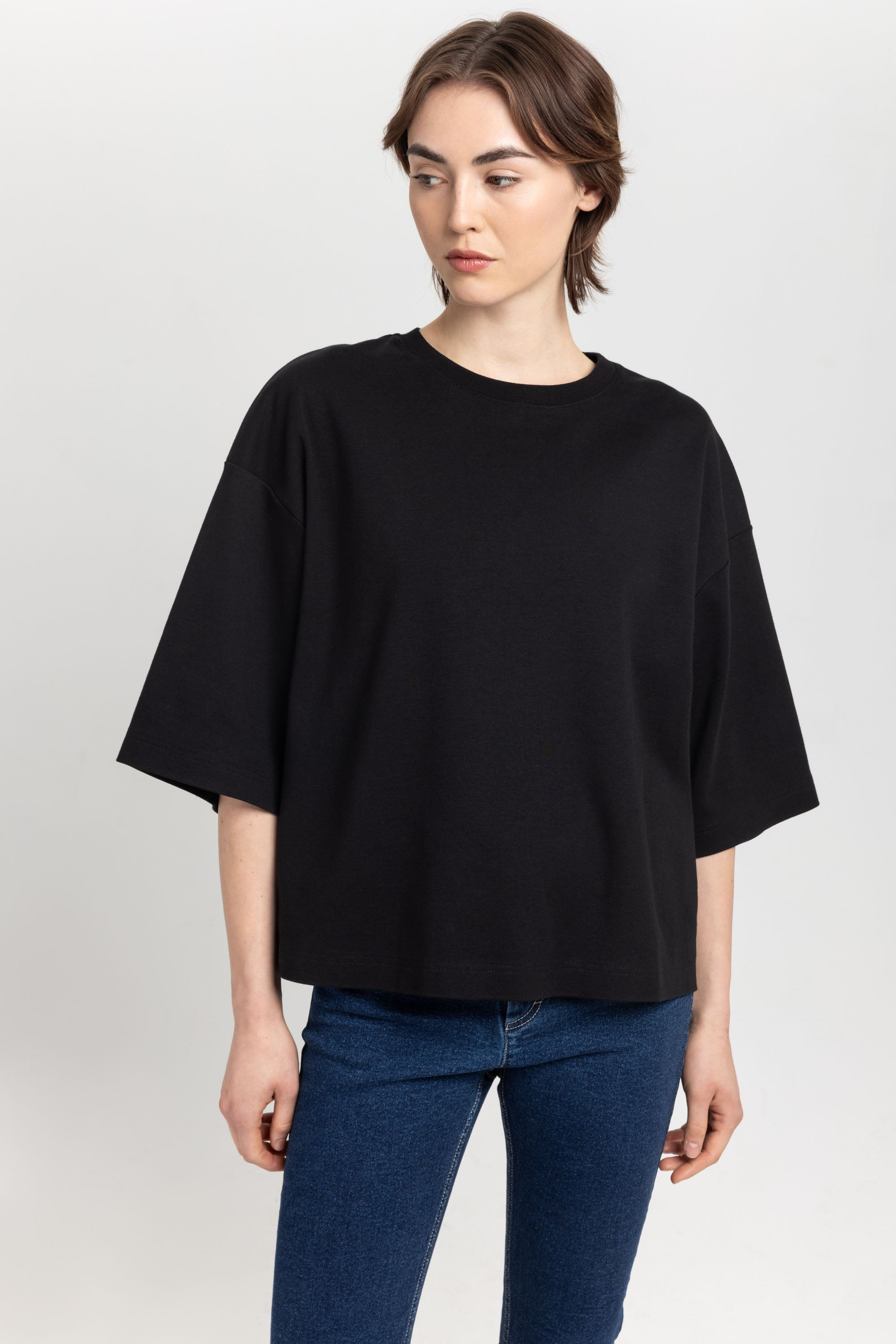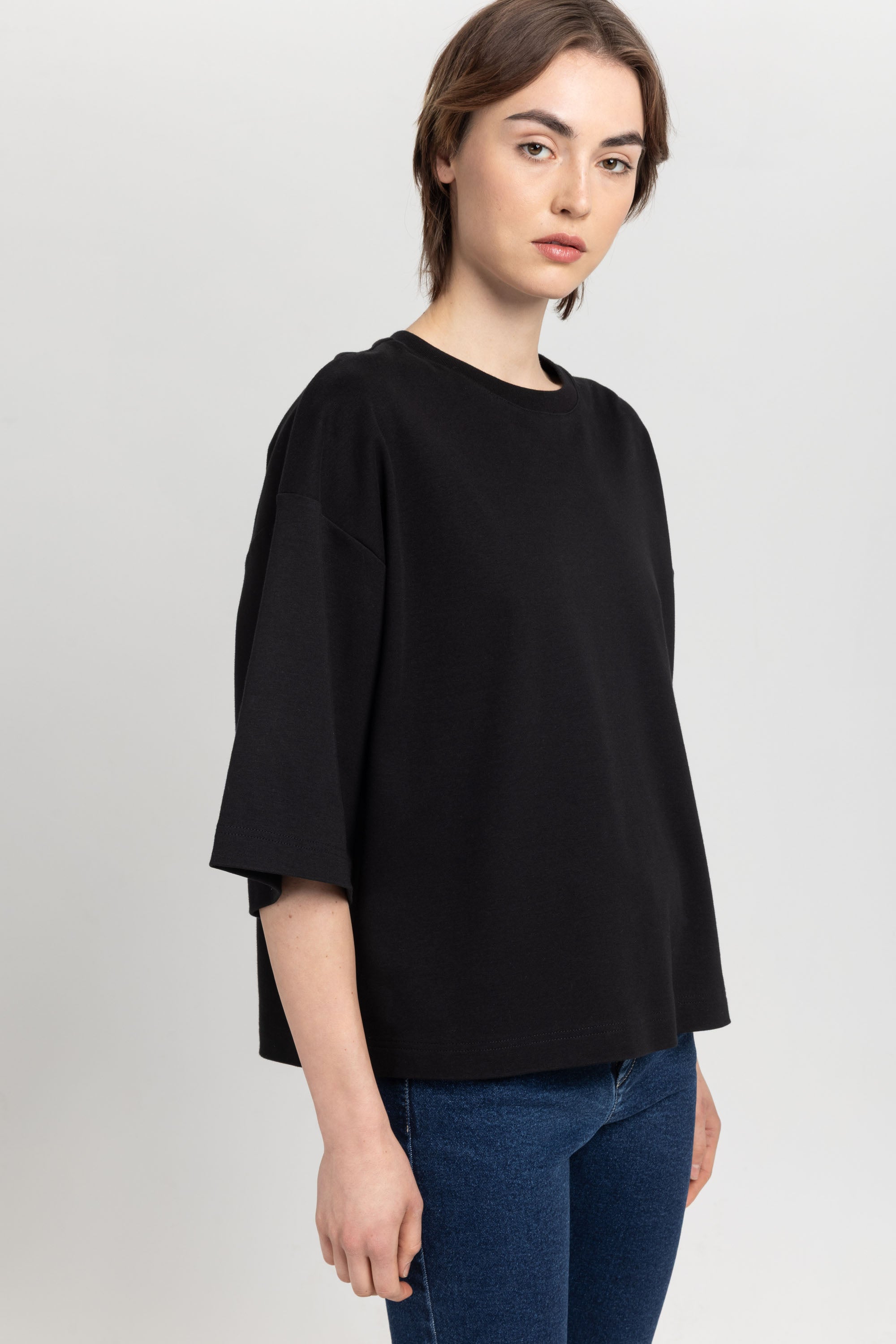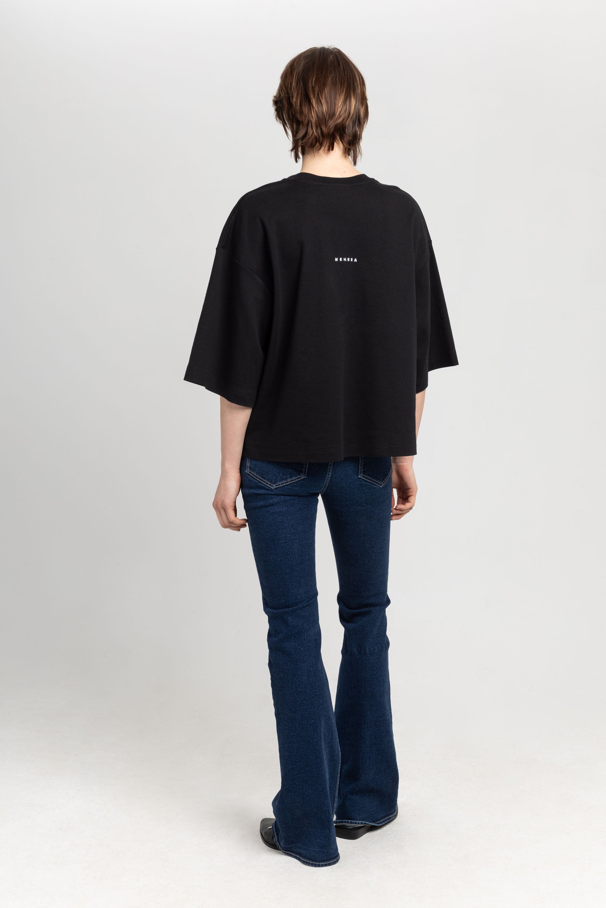 The TOVER 1 t-shirt is crafted from heavy black cotton with a relaxed unisex drape. Finished with understated white logo embroidery at the back. Designed to slip easily over the TUNIS T-shirt, or to be worn solo for a refined everyday uniform.