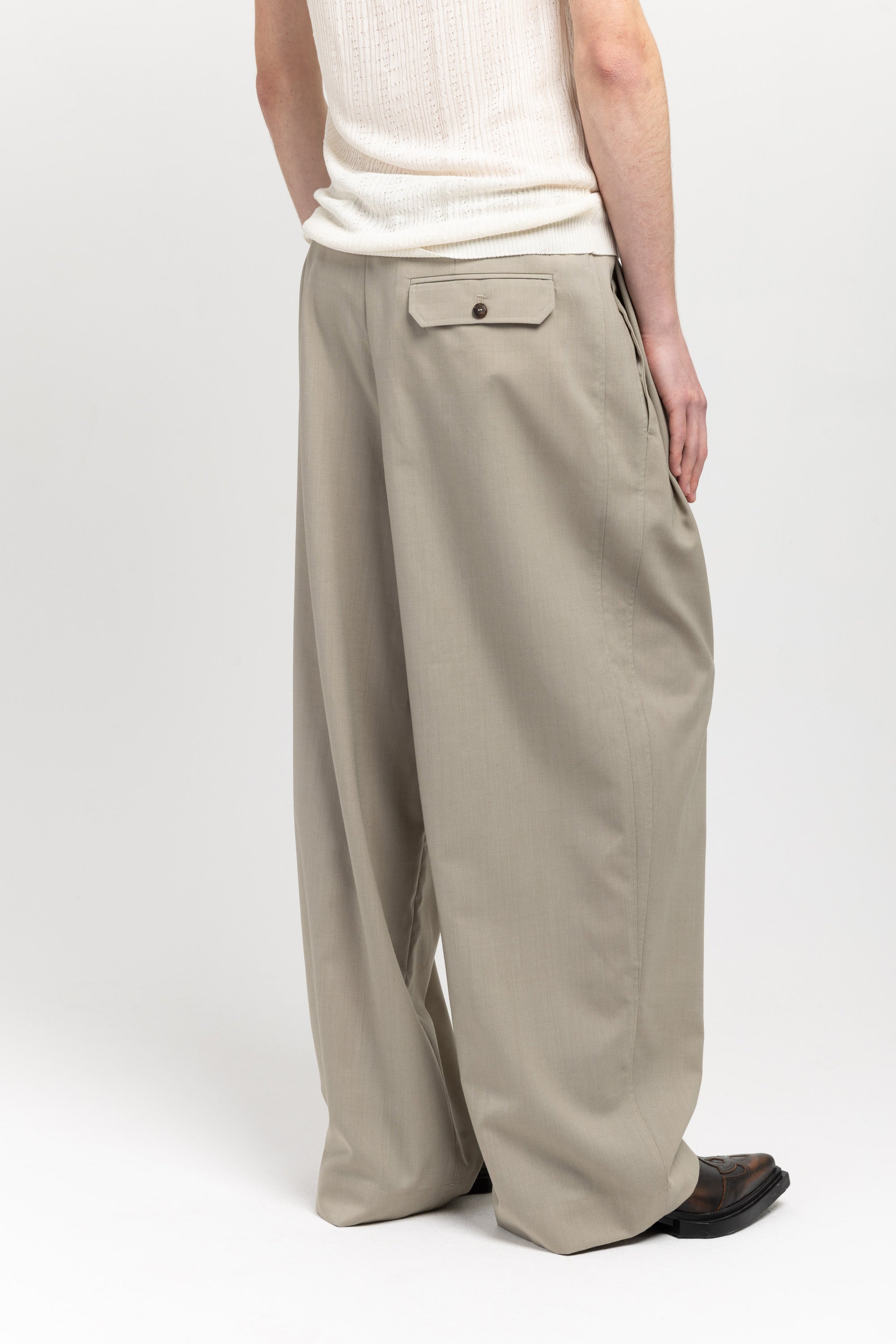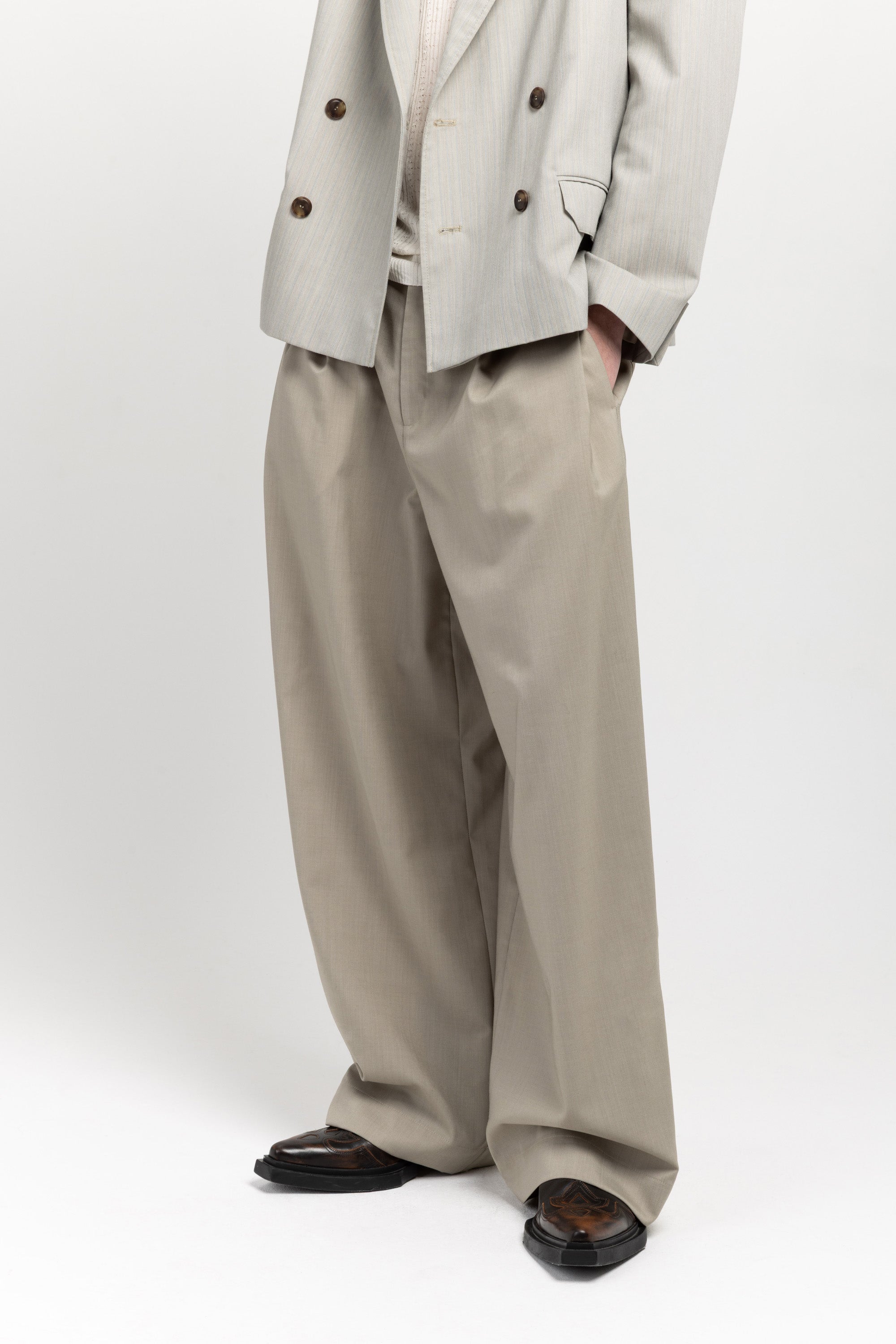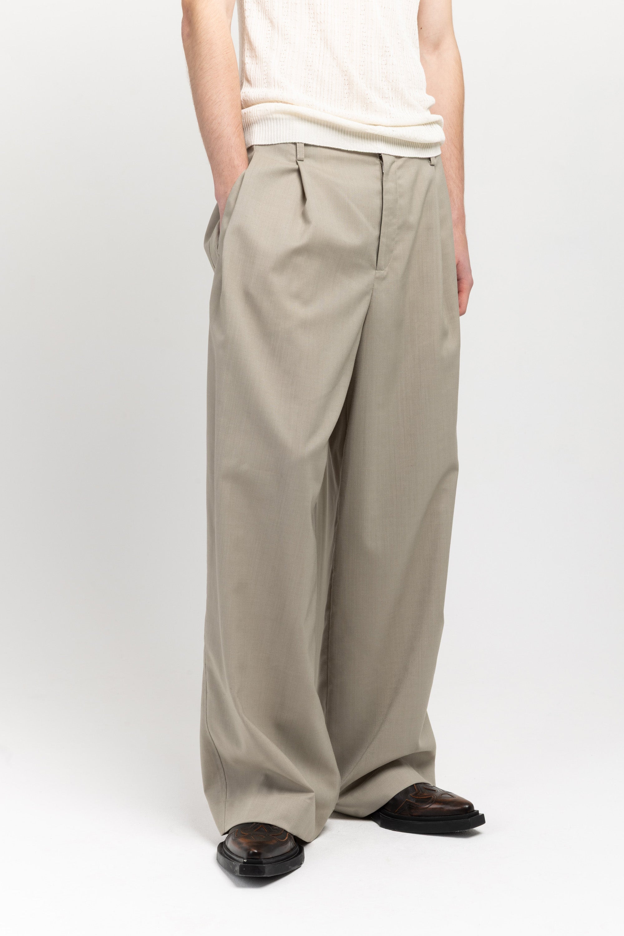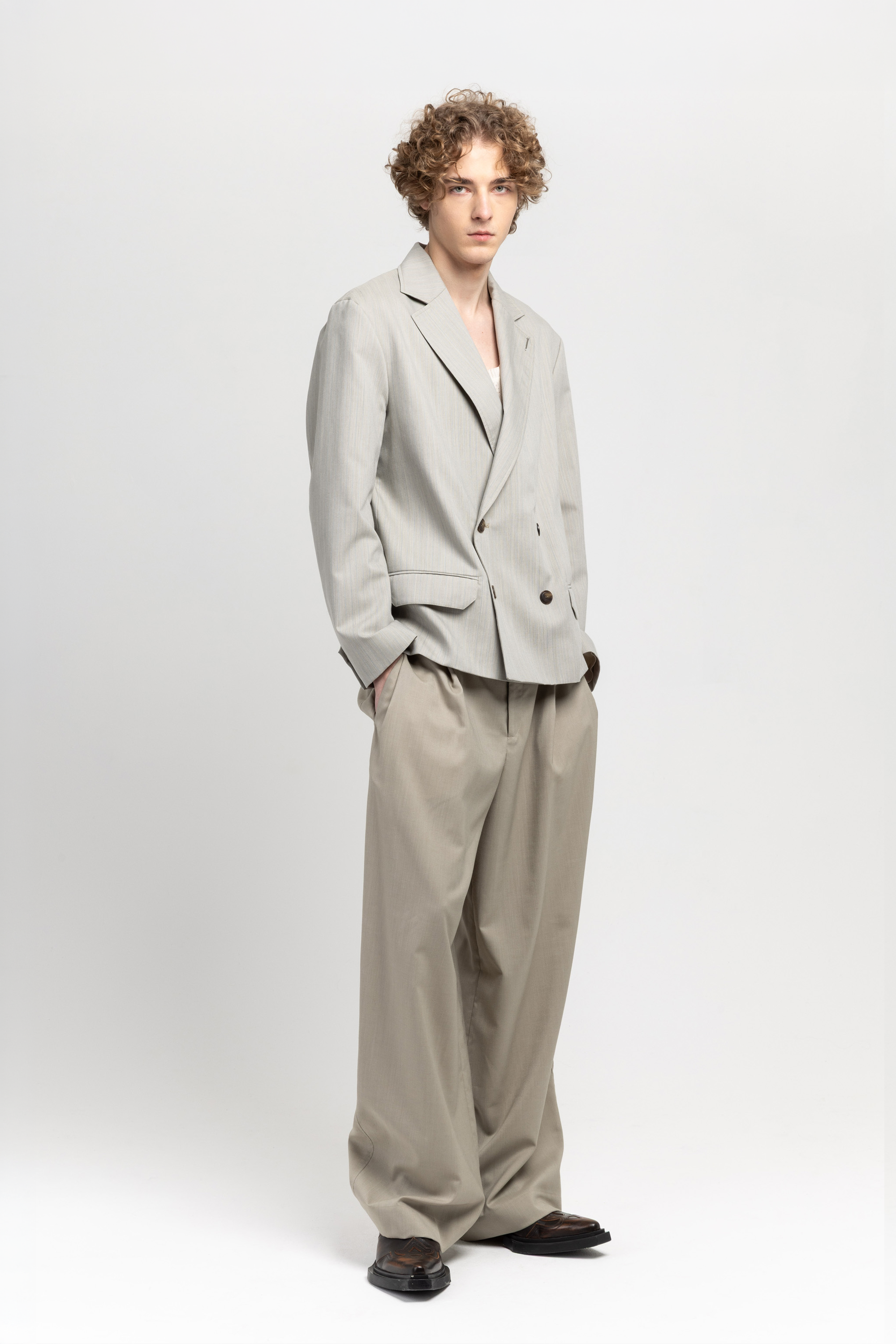 The PARVIN MAN is a pair of relaxed, pleated-front pants in sage beige wool canvas, offering fluid movement and a soft, draped finish. They pair well with the JOACHIN MAN jacket for a tonal ensemble.