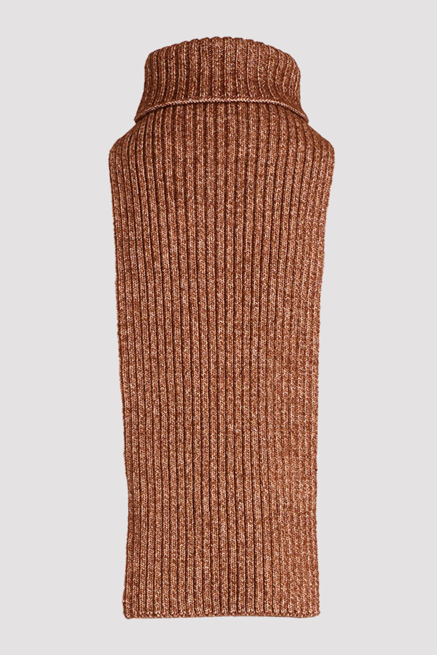 A refined neck warmer crafted in soft cotton and merino wool with a chunky basket weave texture in warm toffee brown hue. Made to layer effortlessly over knitwear or outerwear, providing warmth and subtle structure. A must-have accessory for the season ahead.