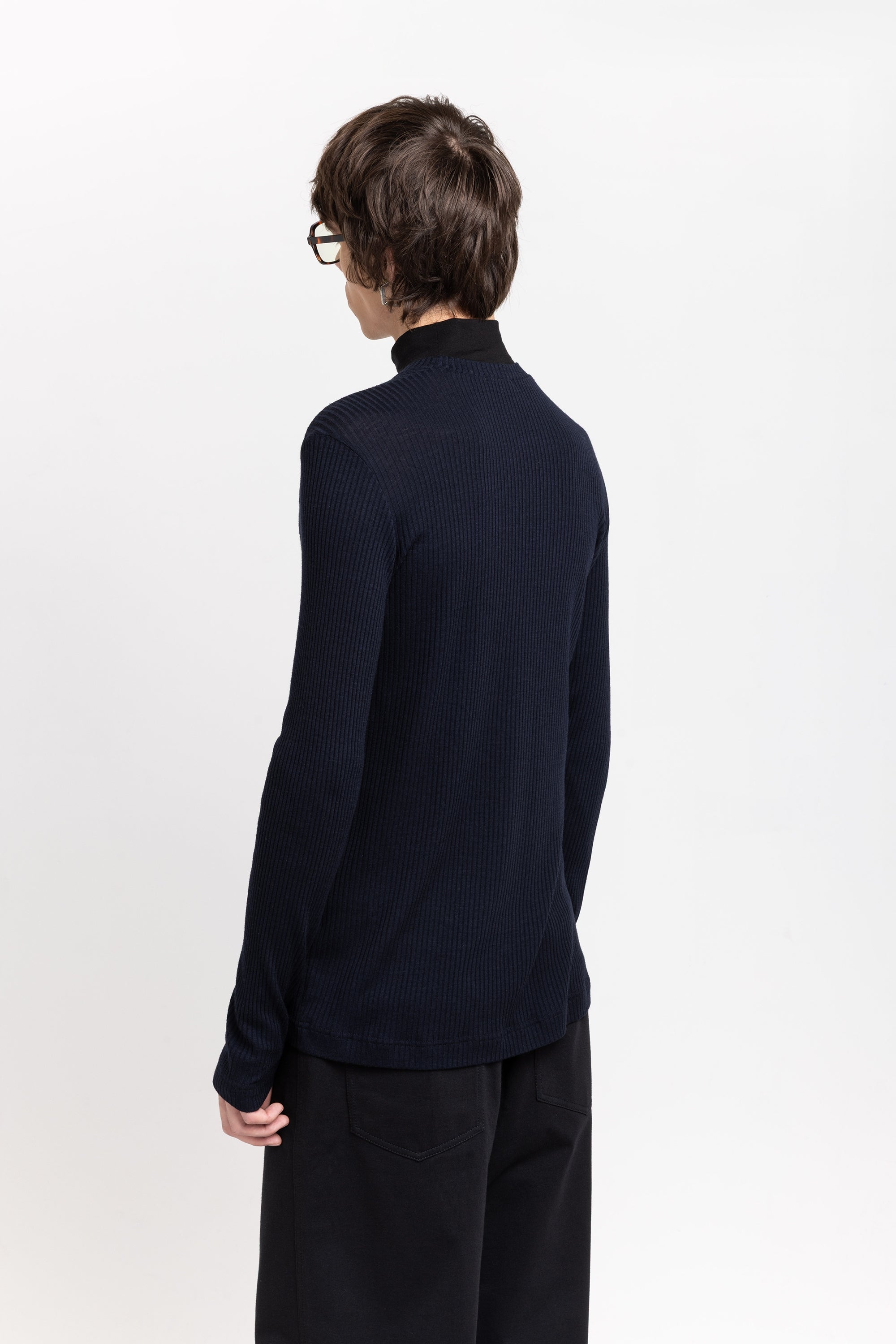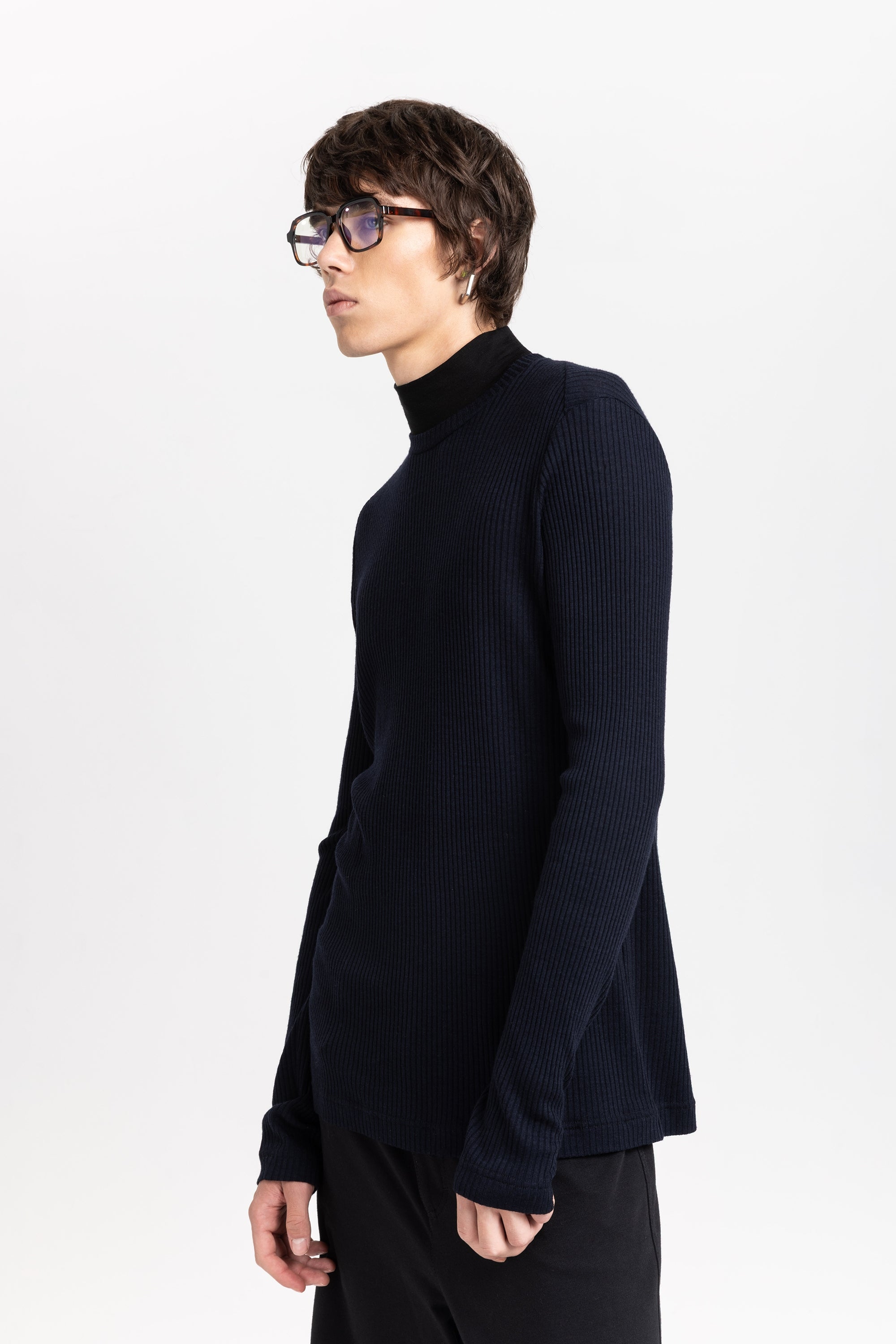 The TORBEN MAN rollneck is crafted from navy & black thin wool jersey, offering a sleek, fitted silhouette. Combining structured tailoring with comfortable stretch, it’s a modern essential for layering or standalone wear.