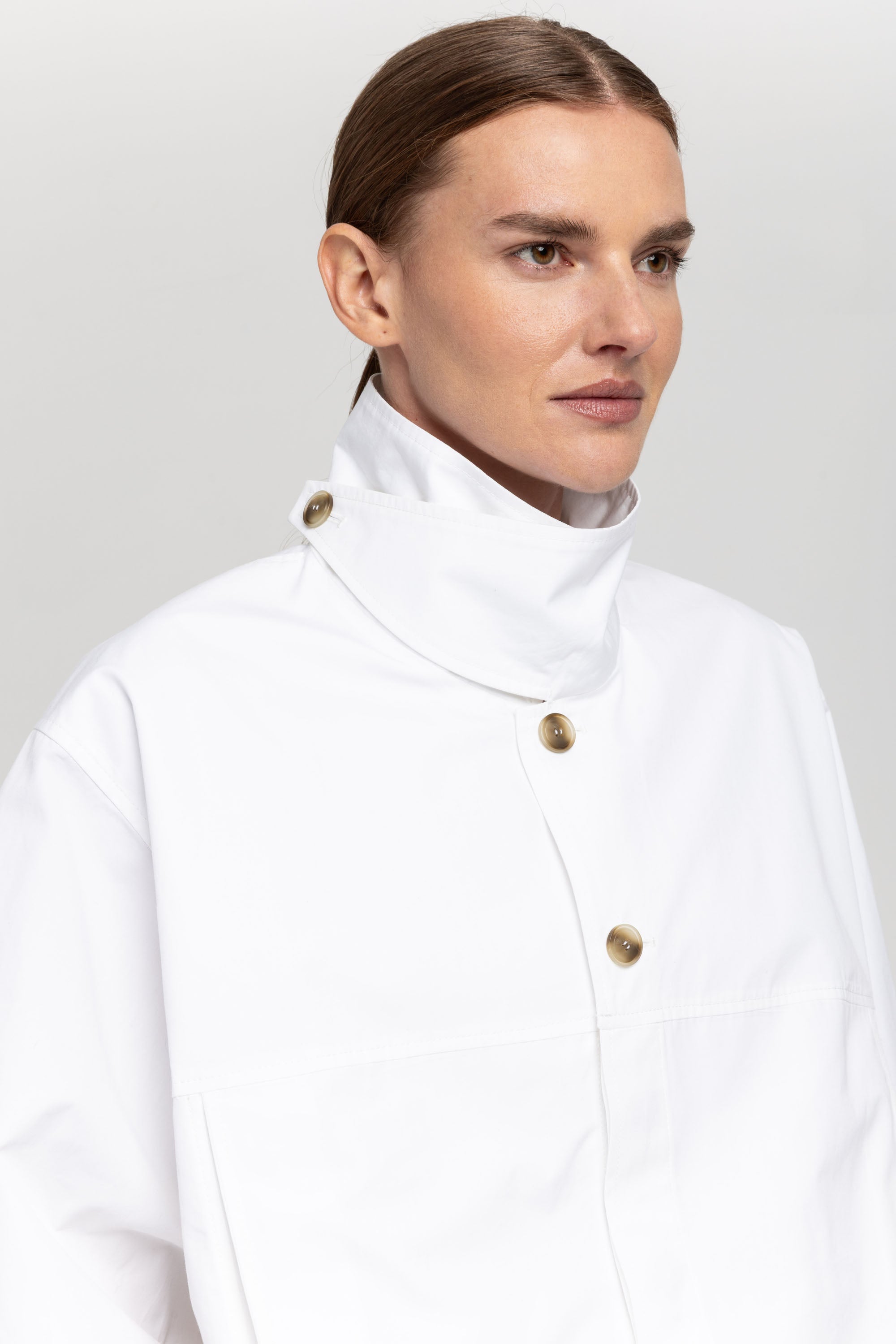 JOZEFINA 1 is a unisex urban jacket in white made from washed poplin. It has a relaxed fit, button front and clean design. Can be paired with PAVOS pants.